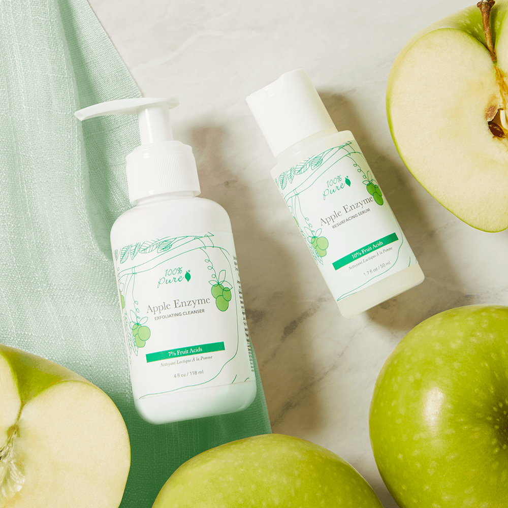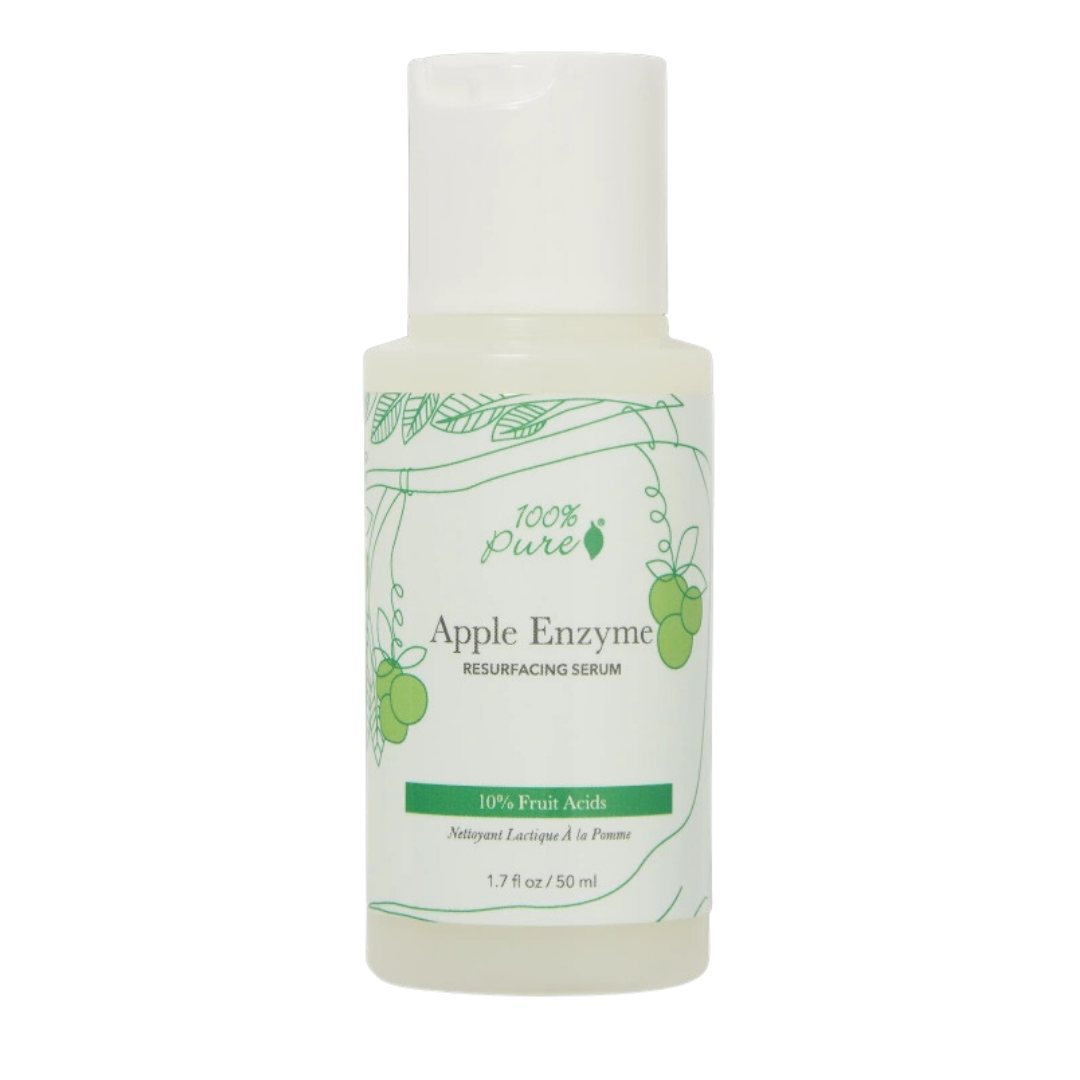 100% Pure 10% Fruit Acids Apple Enzyme Resurfacing Serum – 50 ml er et regenerativt serum laget med hudlysende lakris, kojic syre fra sake (gjæret ris), sukker alfa-hydroksysyre, betemelkesyre og fruktenzymer fra ananas, grønt eple, sitrus og papaya. 10 % av disse glødforbedrende aktive stoffene fungerer sammen for 3 hovedfunksjoner: