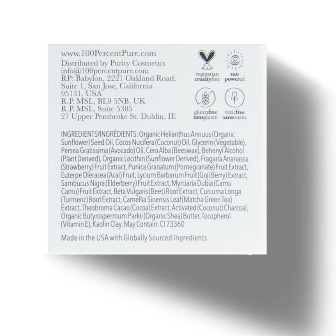 Produkter fra 100% Pure er fremstilt av helt naturlige ingredienser på en økologisk måte helt uten såpe, kjemiske tilsetningsstoffer, syntetiske kjemikalier, farge eller andre skadelige ingredienser. Produktene er 100% naturlige, 100% veganiske og glutenfrie. Frukt pigmentert makeup ® er 100% Pure sitt registrerte varemerke og patent.