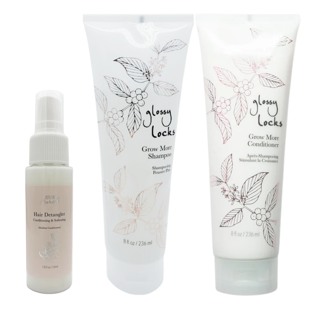 Produktnummer: GLHSGM16OZ-1-1-1Hårpleiepakke med 100% Pure Glossy Locks Grow More shampoo & conditioner + detangler. Rensende og næringsgivende trio som stimulerer hårvekst og tilfører fuktighet.