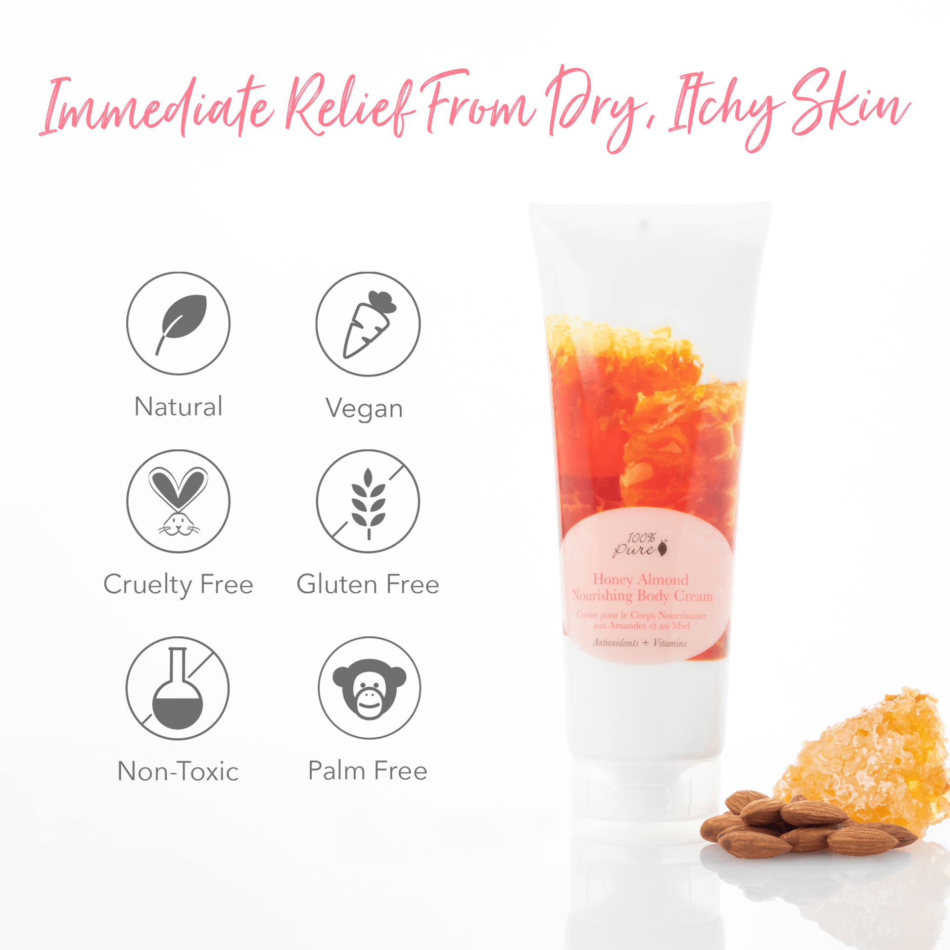 100% Pure Honey Almond Nourishing Body Cream er en svært nærende, luksuriøs økologisk kroppskrem konsentrert med potente anti-aldrende antioksidanter, vitaminer, mykgjørende fruktoljer, fuktighetsgivende kakao og avokadosmør. Denne deilige luktende kroppskremen vil umiddelbart fukte, mykne og tilføre huden næringsstoffer som gir en sunn og glødende hud.