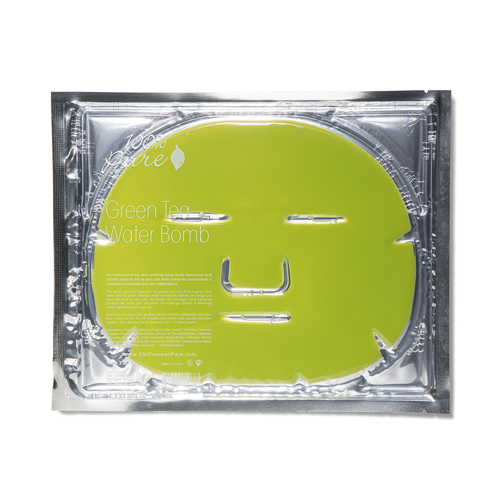 100% Pure Matcha Green Tea Antioxidant Hydrogel Mask -28 gr er en intenst fuktighetsgivende, beroligende ansiktsmaske som bruker forfriskende agurk og kraftig hyaluronsyre for å tilføre fuktighet til tørr hud.