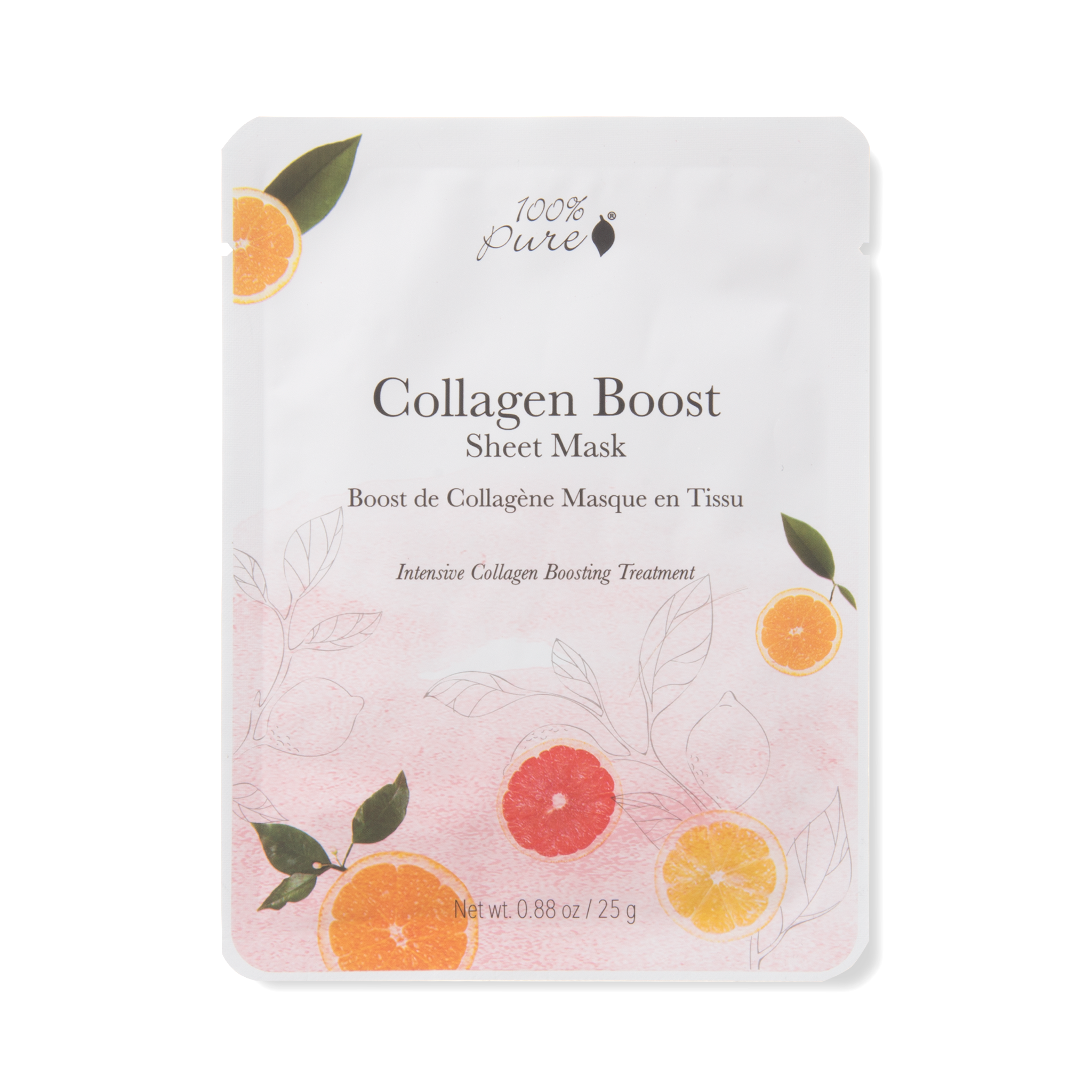 100% Pure Sheet Mask: Collagen Boost – 25 gr er en revolusjonerende ansiktsmaske med revitaliserende ginseng, retinol og vitamin C. Tre vitale ingredienser som stimulerer collagen og elsastin produksjonen, noe som gir mindre linjer, rynker og gir fastere hud.