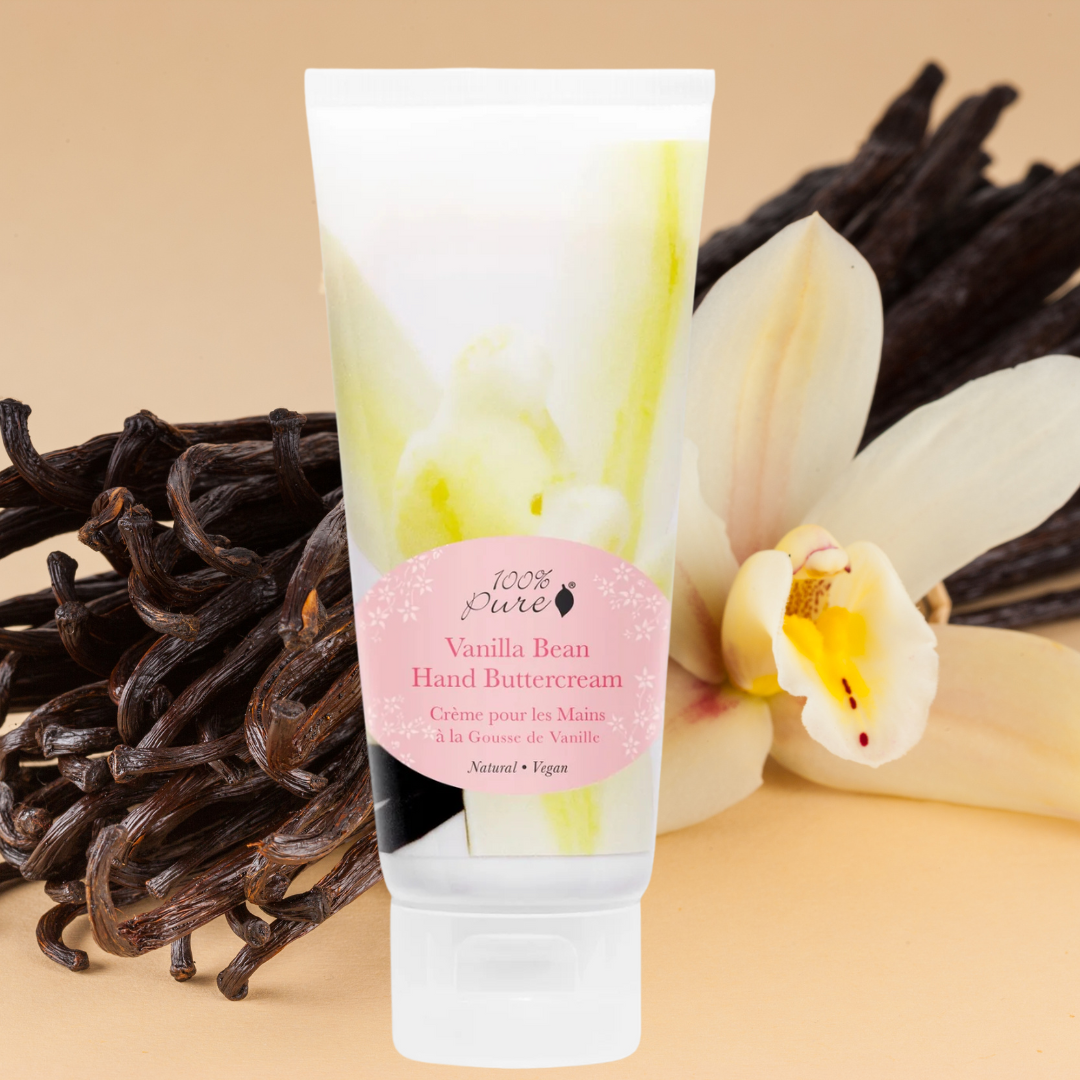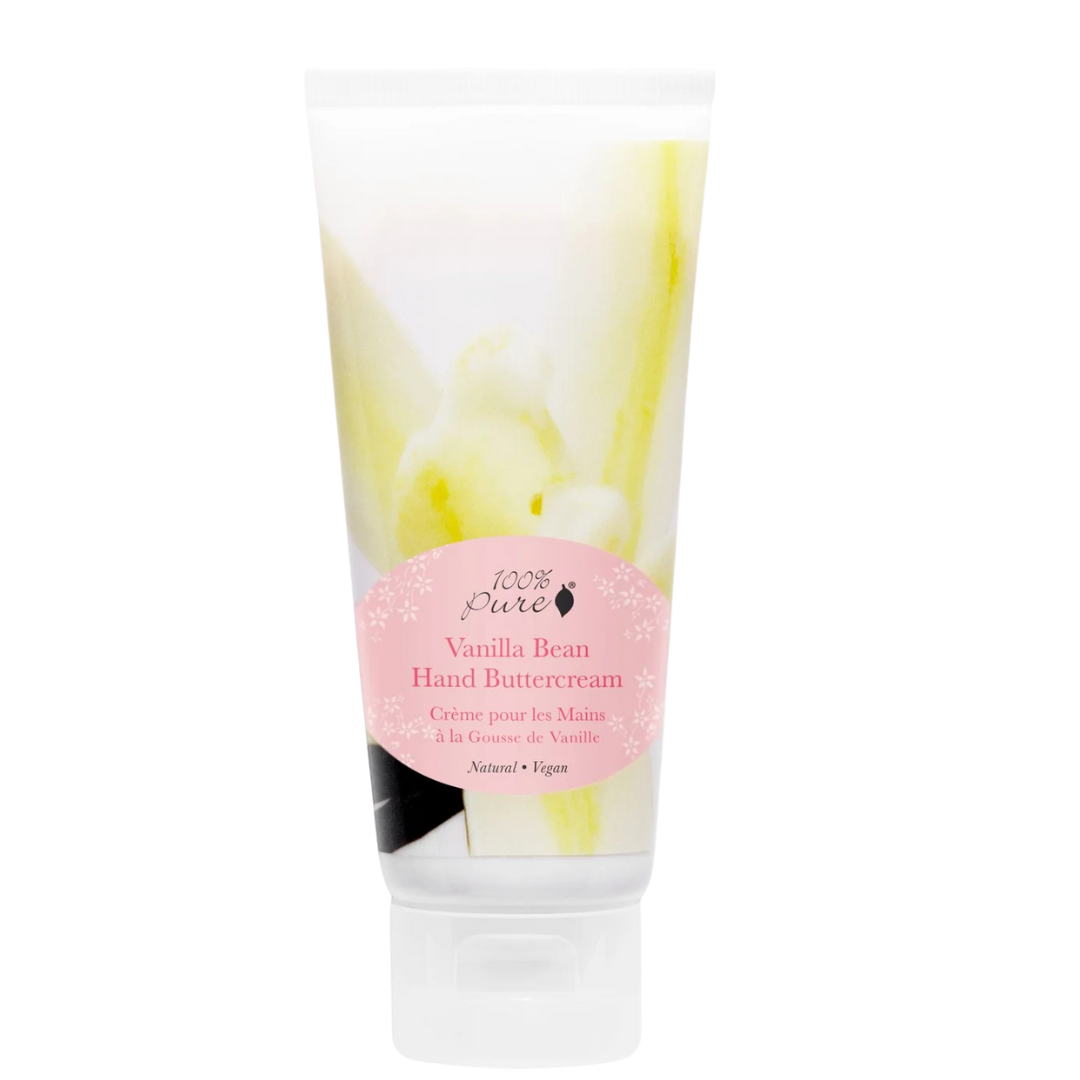 100% Pure Vanilla Bean Hand Buttercream er en rik håndkrem som gir masse fuktighet og mykere hud, samtidig som den gir næring til tørre hender med anti-aldrende vitaminer og antioksidanter. Velg mellom flere deilige dufter.