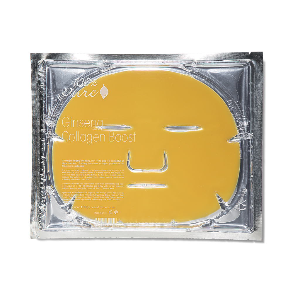 - 100% Pure Ginseng Collagen Mask er en anti-aldrende og hudfornyende ansiktsmaske. Ginseng er veldig anti aldrende og en hudfornyende rot, som pakket full med næringsstoffer. Ginseng øker collagenproduksjonen og gir en fastere og mer elastisk hud.