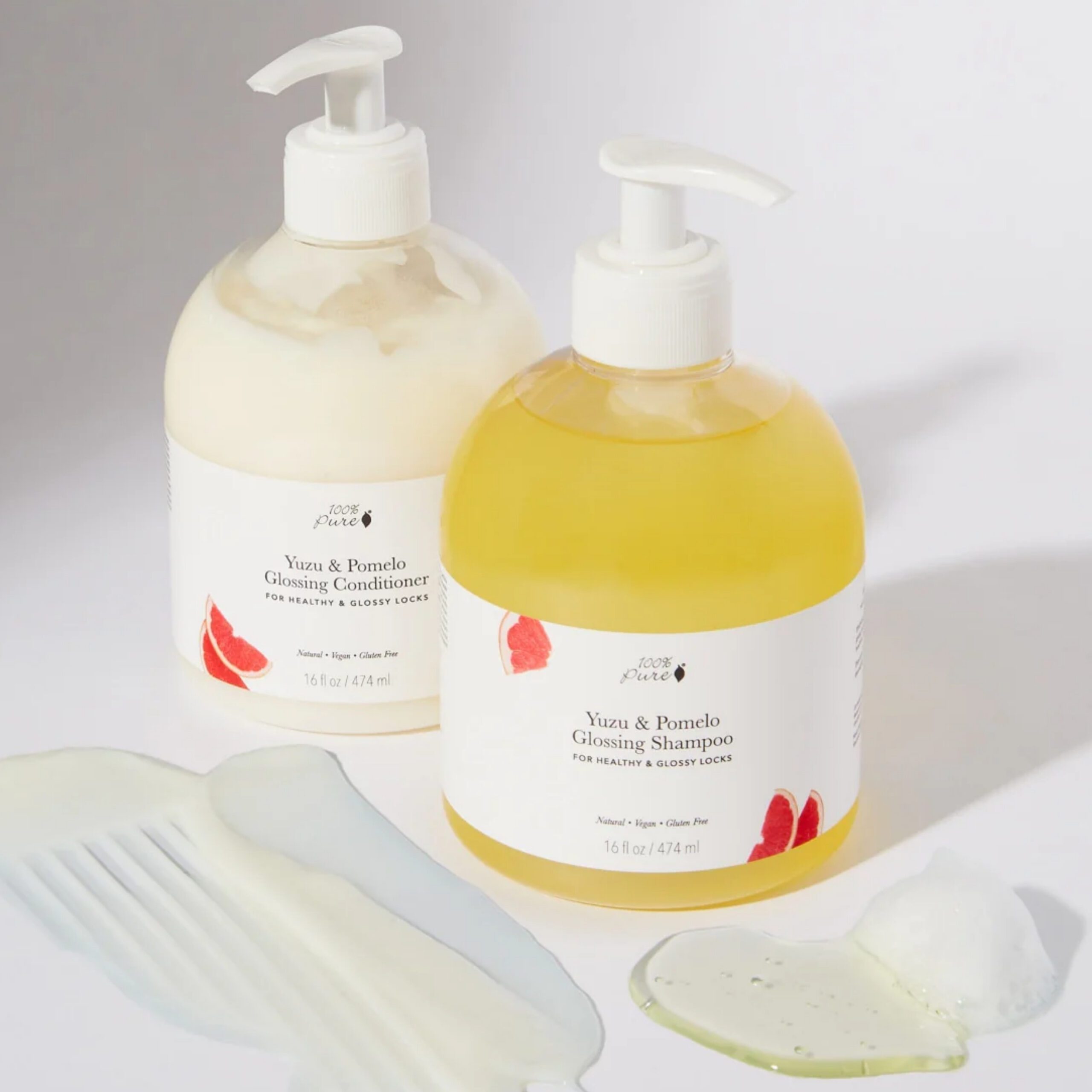 - Mange glansgivende balsamer bruker silikoner, som legger en kunstig hinne over håret. Yuzu & Pomelo Glossing Conditioner gir glans ved å rense bort oppbygging og tilføre ekte næring – slik at håret reflekterer lys naturlig.