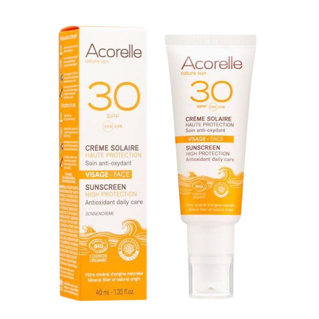 Acorelle Sun Face Cream SPF 30 – 40 ml er en økologisk sertifisert solkrem for ansikt med solfaktor 30 (uten farge) som passser for alle hudtyper, voksne og barn fra 3 år og opp.