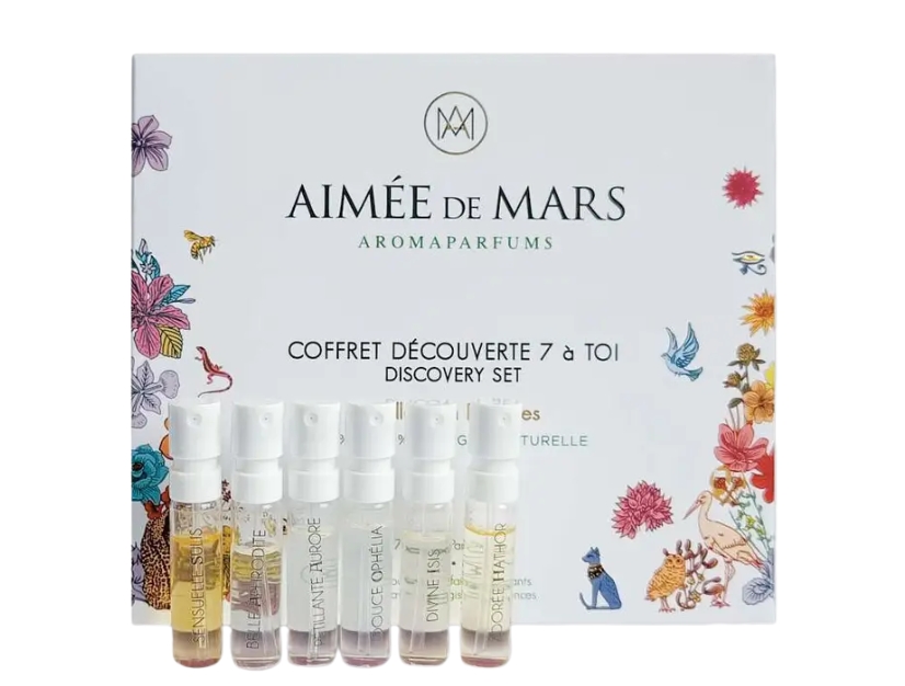 Aimée de Mars Déesses Discovery Box – 7 naturlige parfymeprøver med florale, sitrus- og varme treaktige noter. Vegansk, Cosmos-sertifisert og laget i Frankrike.