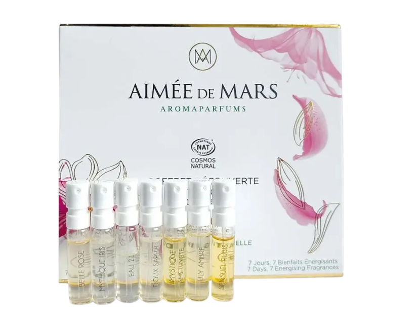 Aimée de Mars Discovery Box – 7 naturlige parfymeprøver med blomster- og orientalske noter. Vegansk, Cosmos-sertifisert og laget i Frankrike.