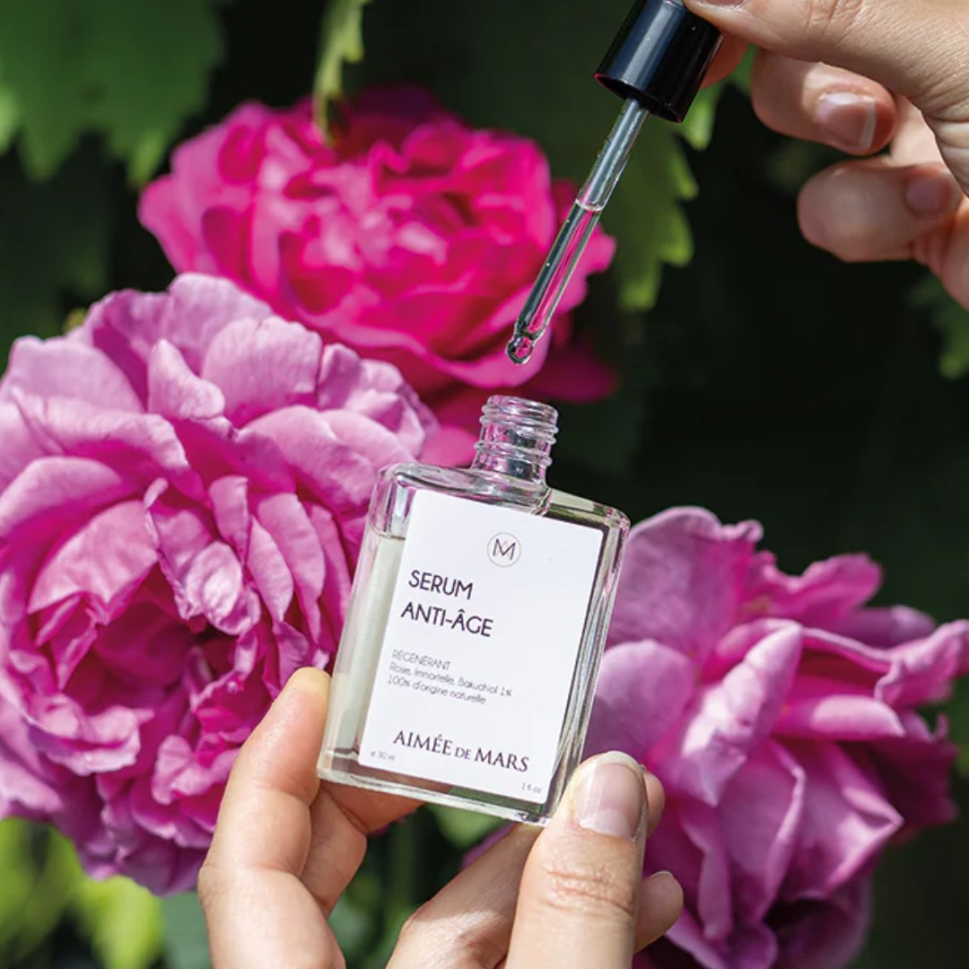 Aimée de Mars Sérum Anti-âge Huile Naturel – 30 ml er et 100 % naturlig og vegansk anti-age-serum formulert for å redusere fine linjer, styrke hudens spenst og forbedre hudkvaliteten – helt uten å irritere huden. Serumet er laget med 1 % konsentrert bakuchiol, det plantebaserte alternativet til retinol, kombinert med solarinfuserte blomsteroljer av rose, immortelle, lavendel og ryllik.
