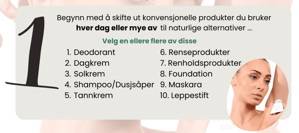 Og det er det kanskje viktigst å bytte ut de som påvirker oss aller mest. Det er de produktene, som trenger gjennom hudbarrieren eller som vi kan spise eller puster inn.