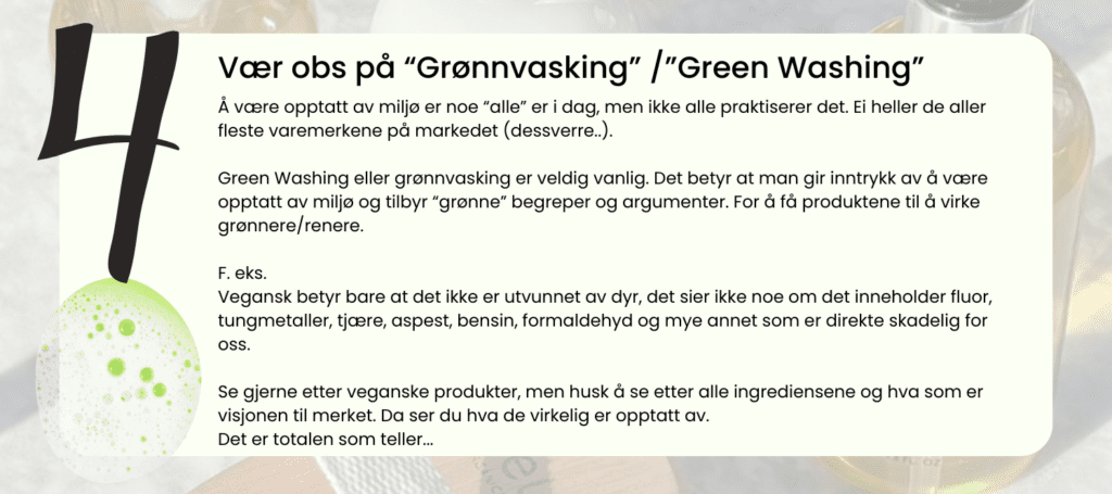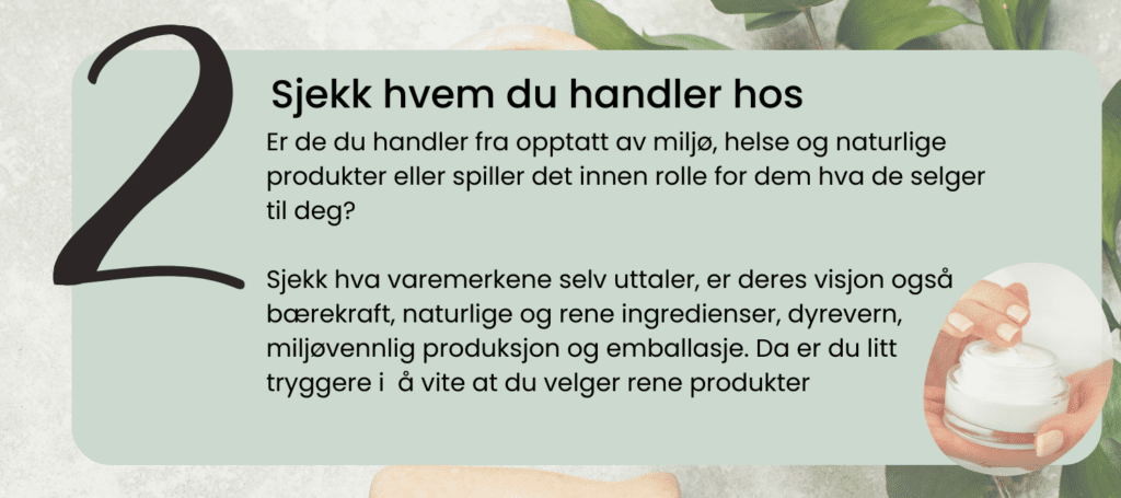 Et annet tips er at du kan sjekke nettsidene til varemerkene. Gå for de som du ser er opptatt av miljø, skriver mye om dette i visjonene sine. (Sjekk ut “om oss”, vår filantropi, vår visjon, om våre ingredienser osv). Det kan si noe om hvor i verden de navigerer i forhold til dette med naturlige produkter. (Se opp for grønn vasking, som vi skriver om litt lenger ned).
