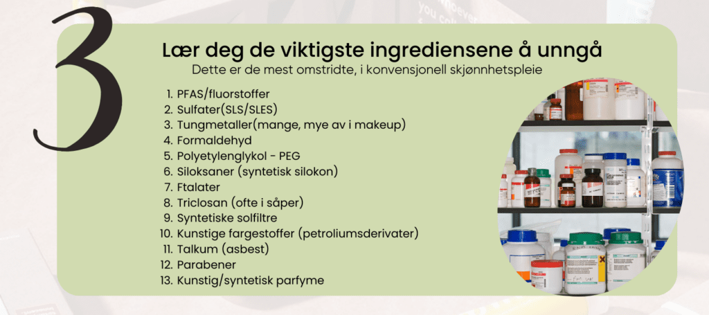PFAS (fluorstoffer/teflon), Sulfater/SLS, Petroliumsderivater (gjerne i kunstige farger), Tungmetaller, PEG`s (genmodifiserte produkter, Silikoner (plast og mikroplast), Formaldehyd, Triclosaner, Kunstige parfymestoffer, Ftalater, Parabener, Kjemiske solfiltre.
