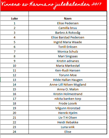 Vi takker for fantastisk deltakelse på årets julekalender. Alle vinnerne er nå trukket, de fleste premiene er sendt ut eller underveis. Siste ukens deltakelse blir sendt ut i løpet av første uken av januar. Dersom du ikke har hørt fra oss, er du dessverre ikke en av de heldige vinnerne denne gangen. Men følg oss på instagram, facebook og på nyhetsbrevet vårt. Vi har flere giveaways og konkurranser, så mulighetene byr seg igjen! GOD NYTT ÅR!! vi gleder oss til et fantastisk 2018, sammen med dere!