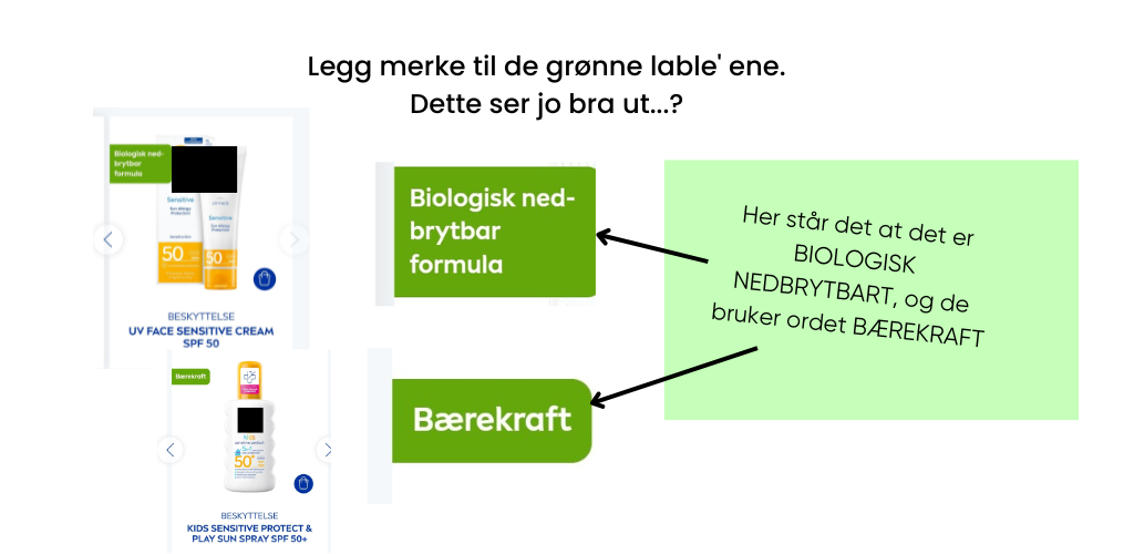 Grunnen til at det er et eksempel på Green Washing er altså at de bruker så mye plass og “grønne labels” som sier at det er bærekraftig – når det ikke er det. Så kan man også finne solkremer som er mye verre enn dette, men det er denne “grønnvaskingen” vi gjør oppmerksom på, som finnes ganske mye av rundt omkring.