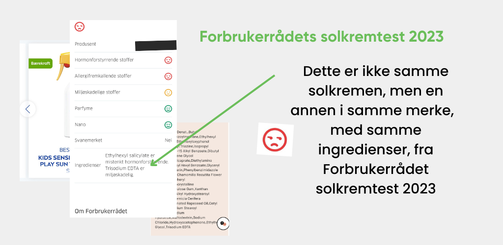 MEN det er et godt eksempel på at de gjør alt de kan for å fremstå som svært “GRØNNE” og sunne.. men som av Forbrukerrådet sin solkremtest i 2023, ikke akkurat skårer så bra fordi det inneholder ingredienser som kan potensielt være hormonforstyrrende og en ingrediens som har vist seg å ikke være nedbrytbart i naturen. Det er ikke farlig for huden, men kan akkumulere seg i naturen. Og da er det litt dumt å bruke så store grønne “labels” som sier at de er biologisk nedbrytbare og spille å bærekraft.