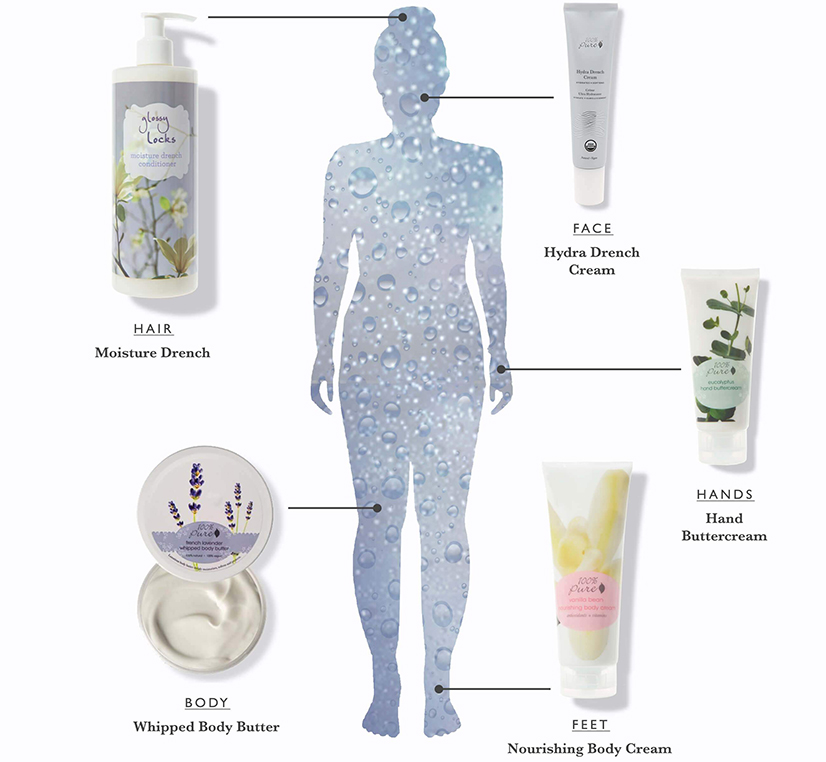 Når du har dekket hår, ansikt og kroppen, så gjenstår det å fokusere litt på hender og føtter. De er veldig utsatt for tørr luft og kulde. Huden kan sprekke, bli irritert, den kan bli ru og irritert. Bruk en god håndkrem, feks Hand ButterCream fra 100% Pure, etter at du har vasket hendene, og få masse essensielle mineraler og oljer som tar vare på og reparerer huden. De er fulle av VItamin E og Argan olje, og absorberer godt inn i huden, uten at den blir “klissete”. For føttende er Nourishing Body Cream et must- have, med en formula med antioksidant rosehip oil og vitamin A, som gir en bedre hudtekstrur og hudfarge. Den er lett og gir en skikkelig babyhud.