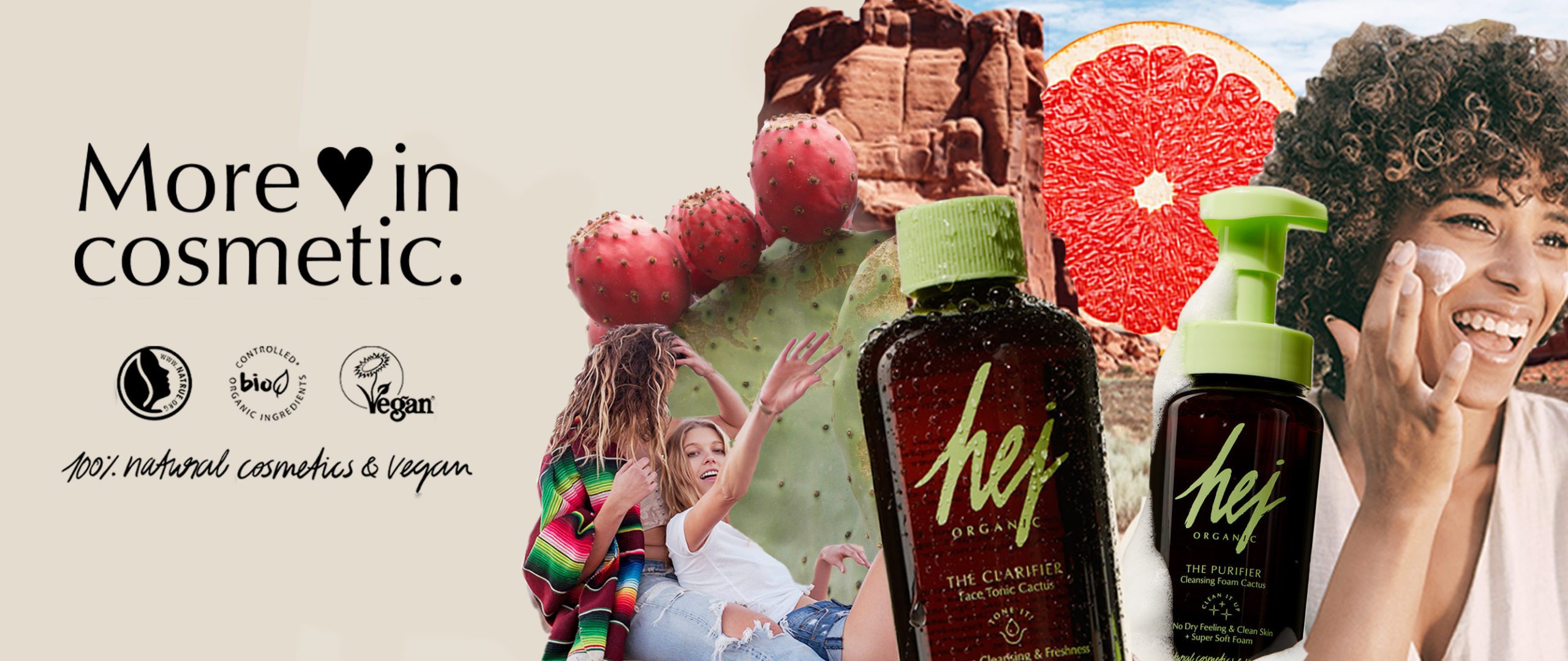 HEJ ORGANIC kombinerer det å lage naturlige produkter av høy kvalitet med et moderne design og ingredienser fra en rettfferdig og bærekraftig produksjon. Produktene er 100% veganske og økologisk sertifiserte av NATRUE.