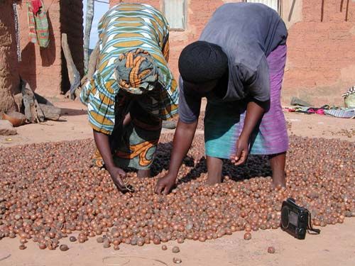Man fjerner først fruktkjøttet rundt sheanøttene, og så knekkes nøttende. Tradisjonelt gjøres dette i en stor morter, eller ved å knuse nøttene mot en stein. Denne separeringen har tradisjonelt vært en sosial aktivitet, hvor unge og eldre kvinner jobber sammen på bakken og knuser nøttene. I dag finnes det nøtteknekker maskiner som gjør dette, som reduserer belastningen ved dette arbeidet betraktelig.