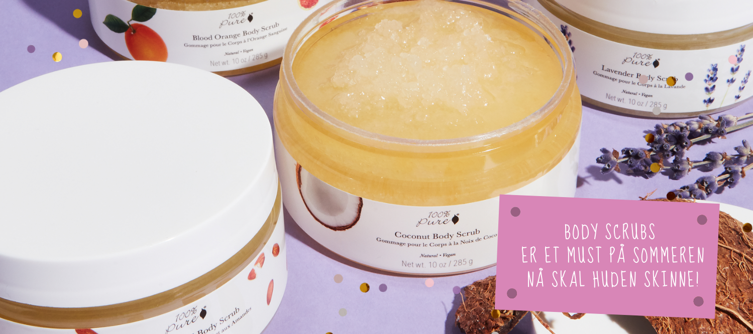 Skrubbe huden er kanskje viktigst akkurat nå, for å få bort døde hudceller, slik at den fargen du får i sommer faktisk treffer friske hudceller og stimulerer melaninet i huden og som gjør deg brun. Det gir deg en dypere brunfarge og som gjør at fargen varer lenger.  En god skrubb øker blodsirkulasjonen, fjerner døde hudceller og gir en friskere hud. Skrubbene fra 100% Pure gir også næring og fuktighet til huden, og gjør at du virkelig får en skikkelig spa opplevelse. Oljen gjør at huden blir supermyk etterpå. Elsker disse.