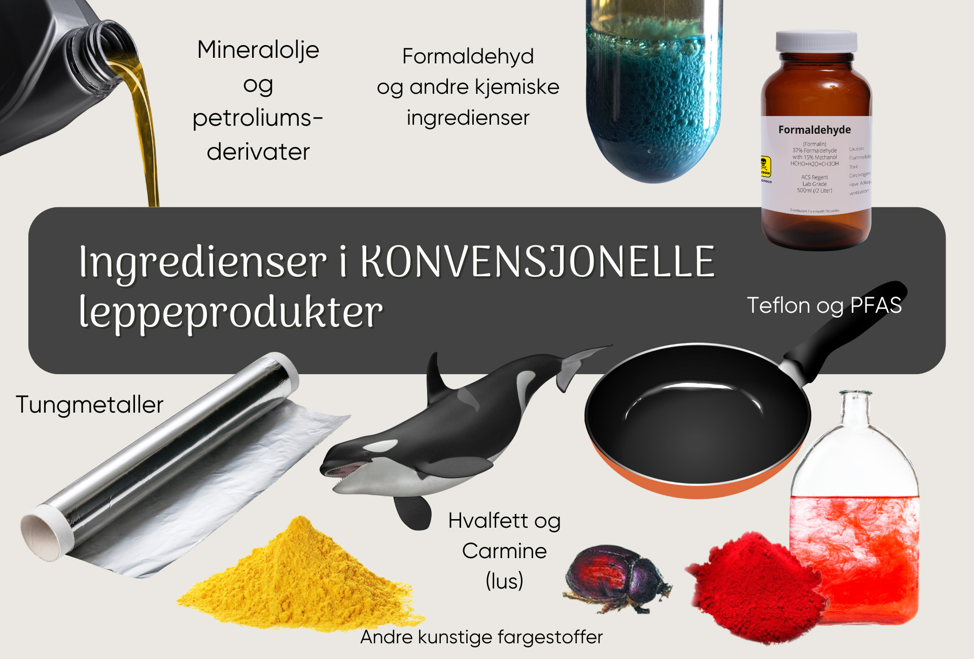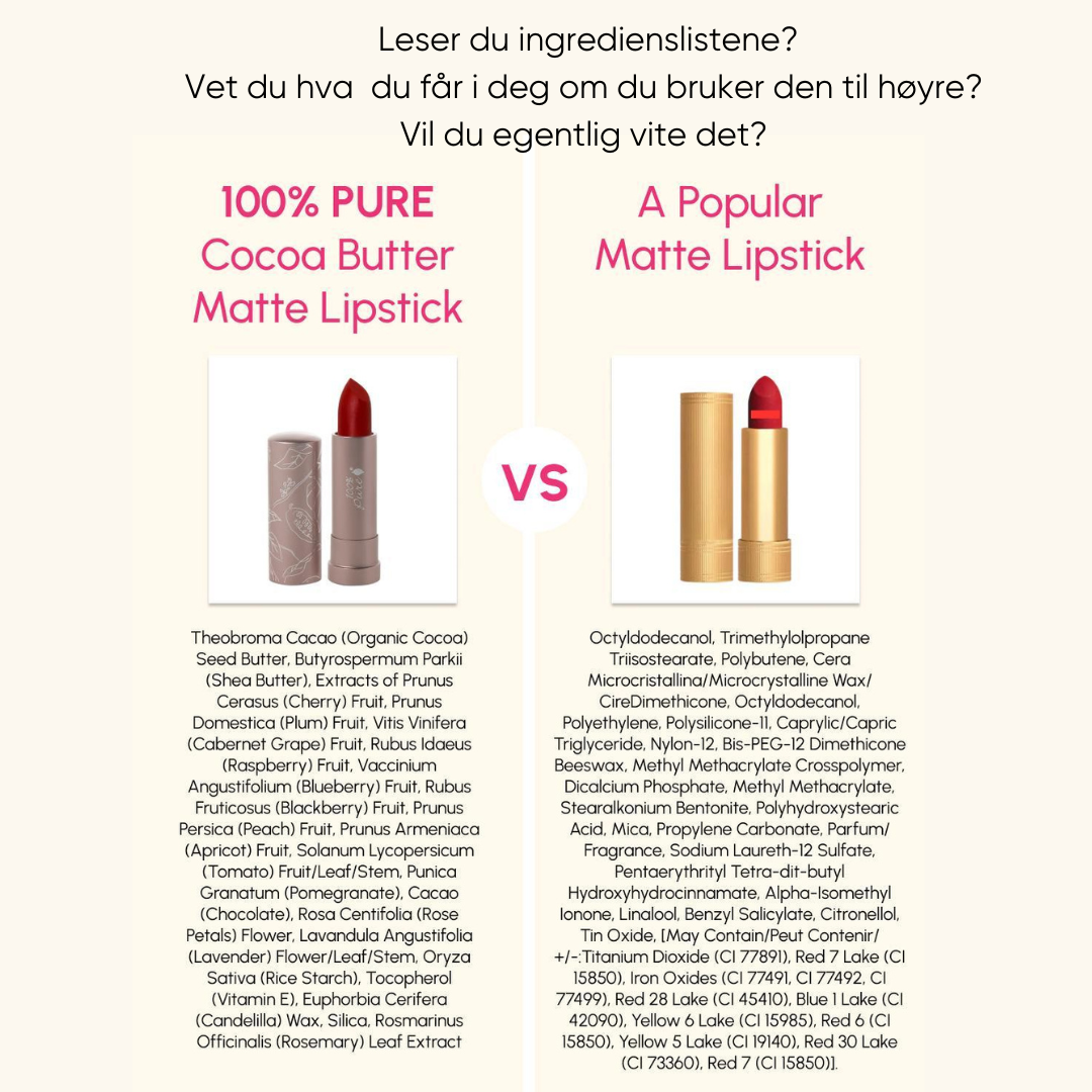 Konvensjonell makeup inneholder syntetiske fargestoffer hovedsaklig fra petroliumsindustrien, og de kan inneholde bindestoffer og andre ingredienser, som tungmetaller, talc, formaldehydfremmere, PFAS, triklosaner, kunstig parfyme, som kamuflerer lukten av de øvrige ingrediensene og mye mer. Mange problematiske stoffer, som kan være allergifremkallende, hormonforstyrrende og ikke minst kreftfremkallende. Mye av den konvensjonelle makeupen inneholder stoffer som kan påvirke reproduksjons evnen til unge jenter. Det er helt forferdelig, og det verste er at mange ikke forstår dette.