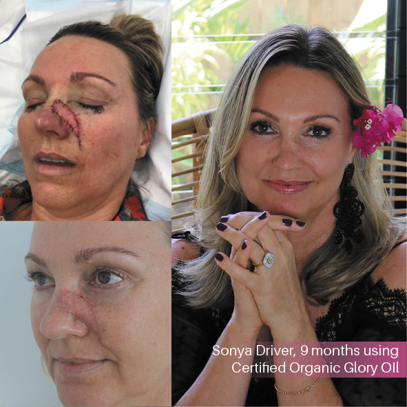 Da Sonya Driver, grunnleggeren av Eco by Sonya, fikk påvist hudkreft og måtte operere bort en stor hudflekk midt i ansiktet, bønnfalte hun sin kjemiker om å lage en mirakelolje for å helbrede arrene på beste måte, kun med økologiske ingredienser selvsagt. Det er slik Glory Oil ble til! Resultatet taler for seg selv, bare se bildene. «Glory Oil er bokstavelig talt en gave fra himmelen!» uttaler Sonya Driver.