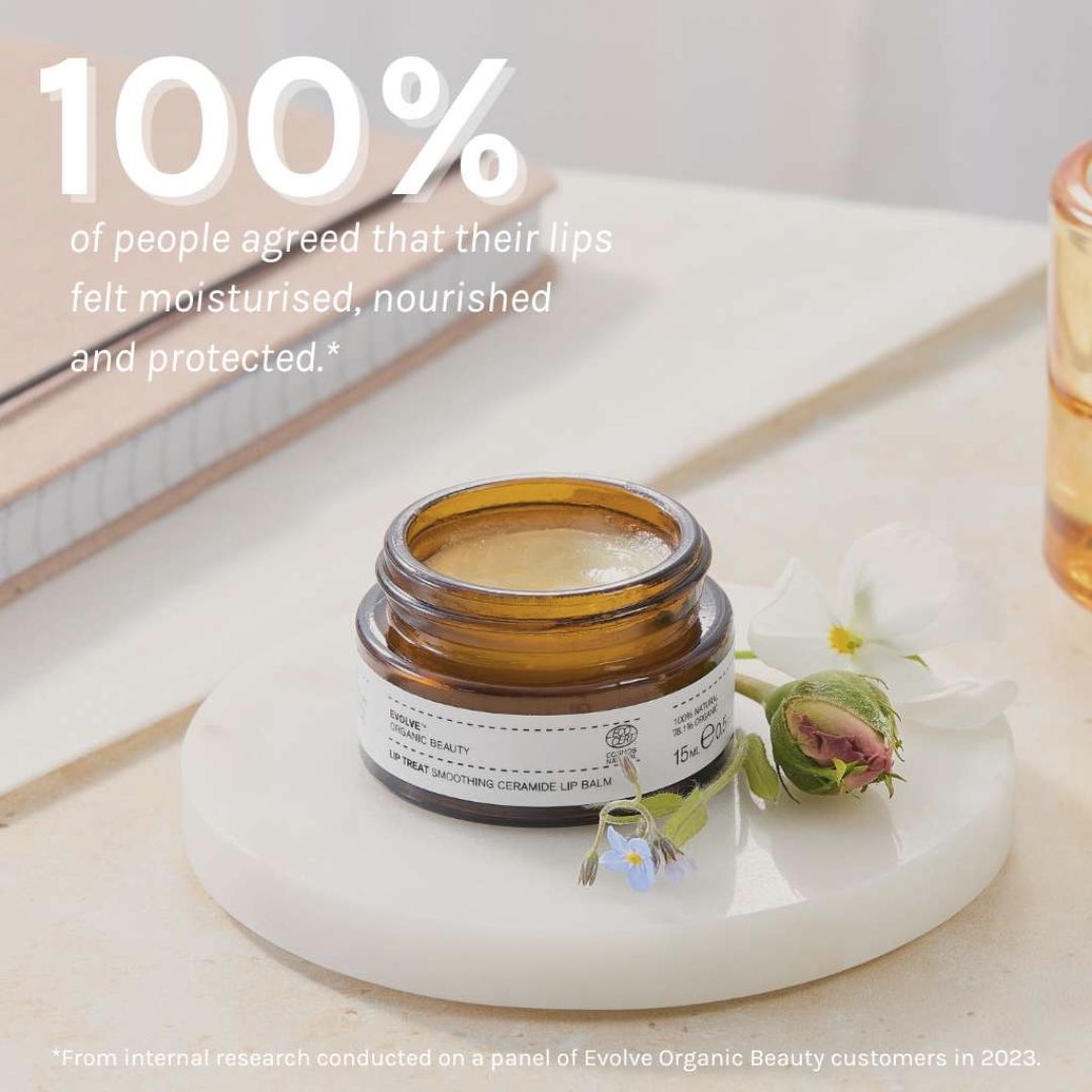 Evolves nye Ceramide Lip Treat Balm er formulert med en 100% vegansk voksblanding, økologisk cupuacu smør og en blanding økologisk jojoba- og nypeolje, supplert med havrebaserte ceramider. Denne nøye sammensatte blandingen tilfører fuktighet samtidig som hudbarrieren styrkes slik at leppene både er næret og beskyttet.