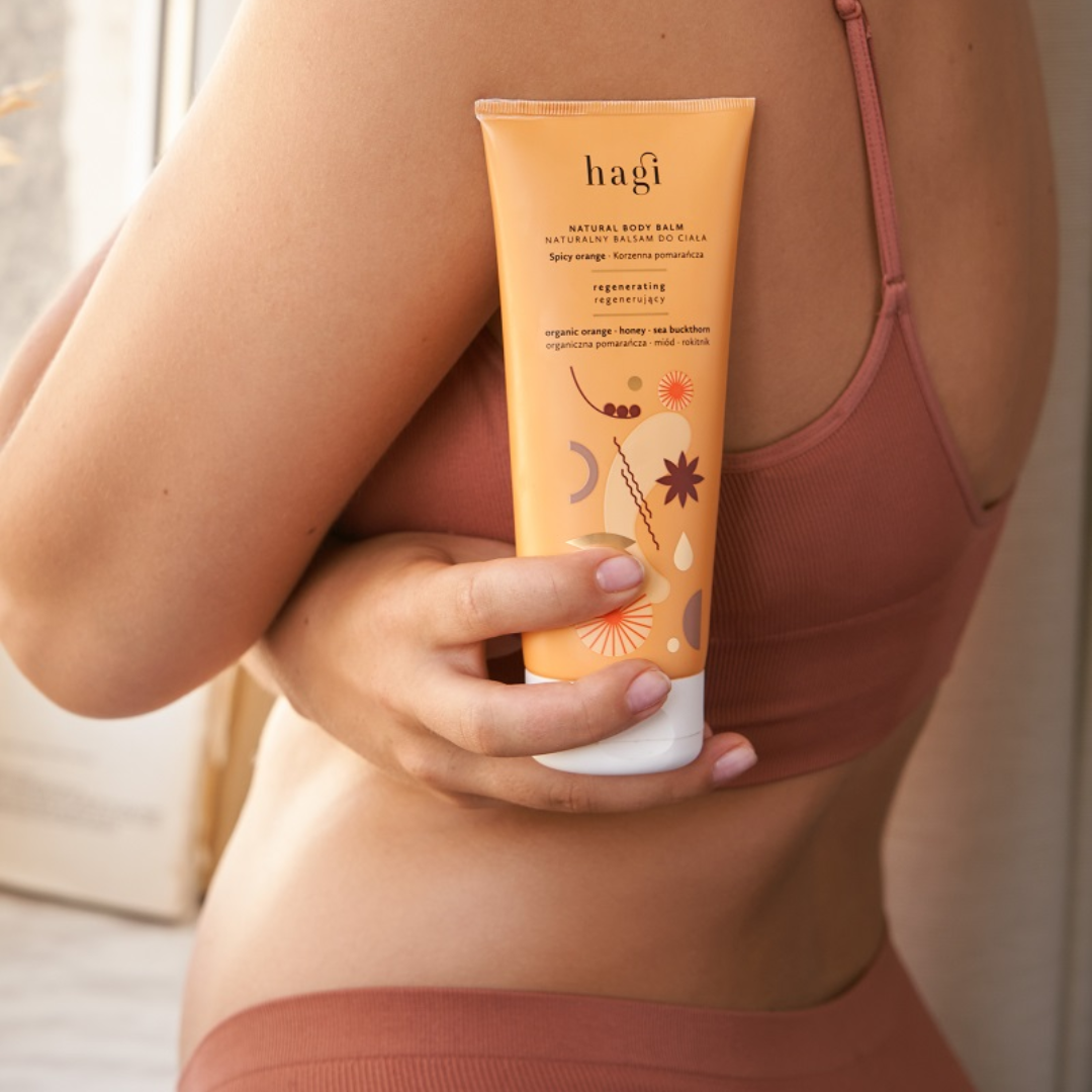 Hagi Natural Body Balm Spicy Orange – 200 ml er en naturlig kroppsbalsam /krem med en energigivende duft av saftige og modne appelsiner og varme noter av krydder som vil gi deg et varmende, aromatisk pleieritual.