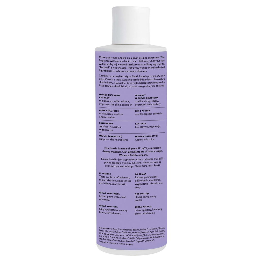 En deilig og naturlig kroppsvask med duft av plomme, vanilje, mandel og eple. Renser huden skånsomt, forbedrer hudtilstanden og støtter hudens mikrobiom.