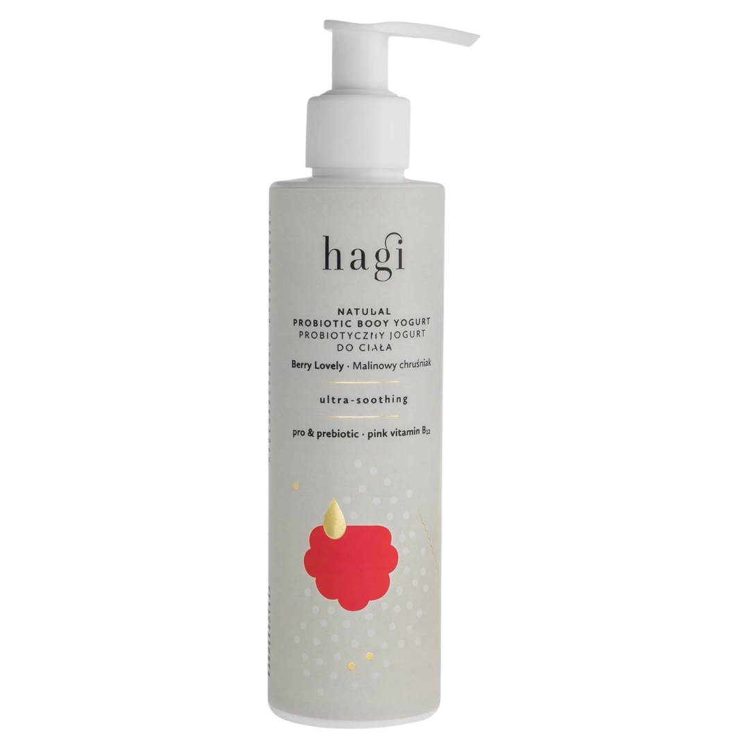 Hagi Natural Body Yoghurt Berry Lovley – 200 ml er en naturlig kroppsyoghurt som har en gel-krem konsistens, den gir dyp fukt til huden og absorberer umiddelbart. Vår kroppsyoghurt har en blanding av ingredienser som tar vare på det epidermale mikrobiomet, og gjenoppretter komforten til en tørr hud. Lukten er av saftige og modne skogsfrukter, og har en lett og behagelig påføring som også dufter godt.