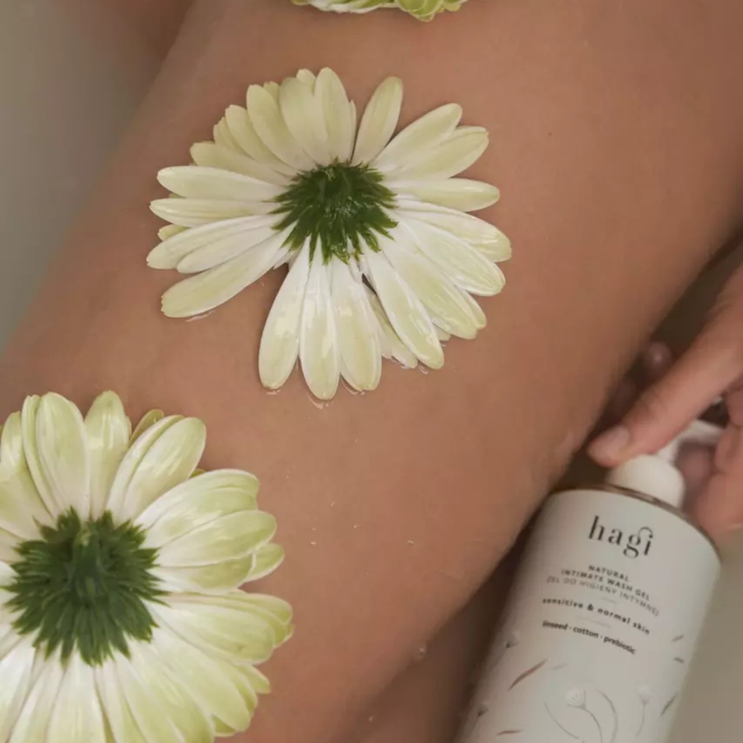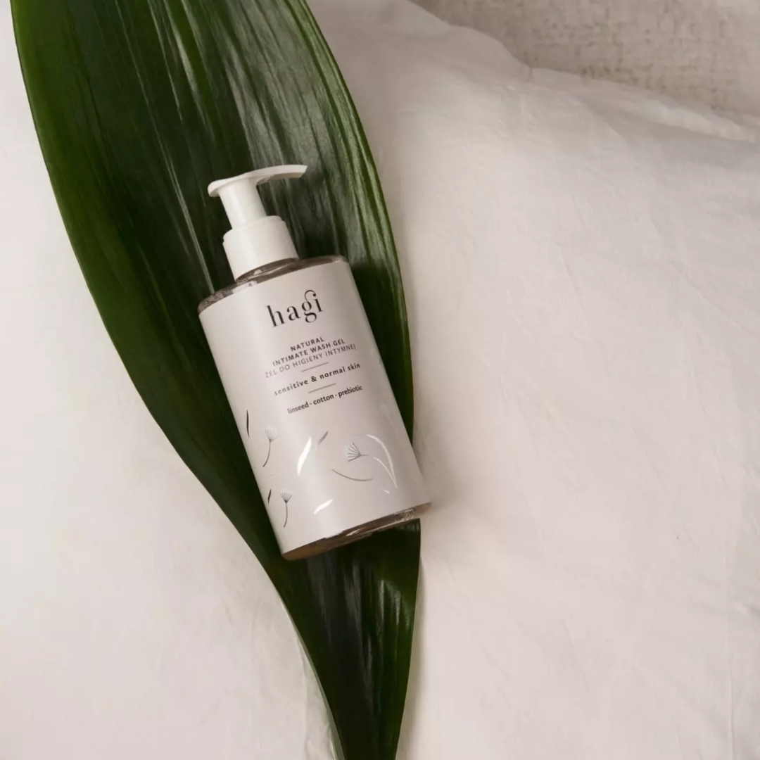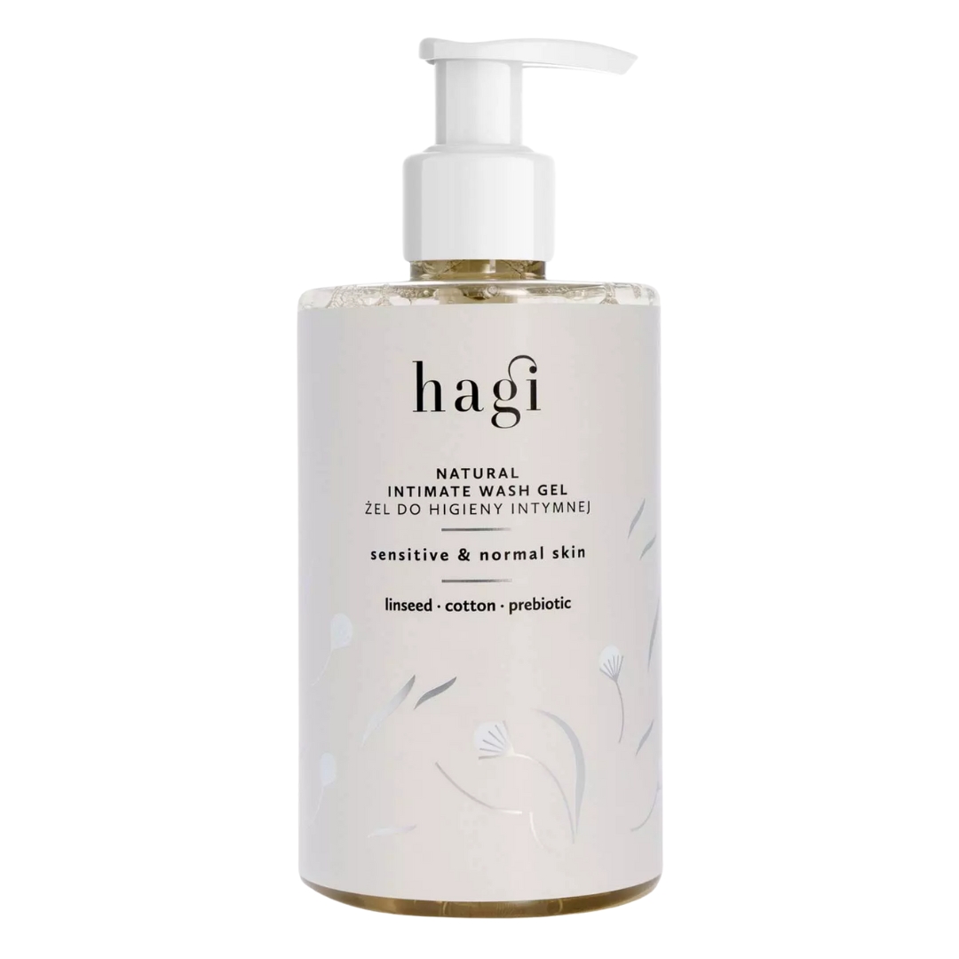 Hagi Naturlig Intimsåpe – Mild og skånsom intimgelé med linfrøolje, bomullsekstrakt, aloe vera og probiotika. Rengjør, fukter og pleier uten å tørke ut huden. Fri for SLS/SLES og syntetiske ingredienser.