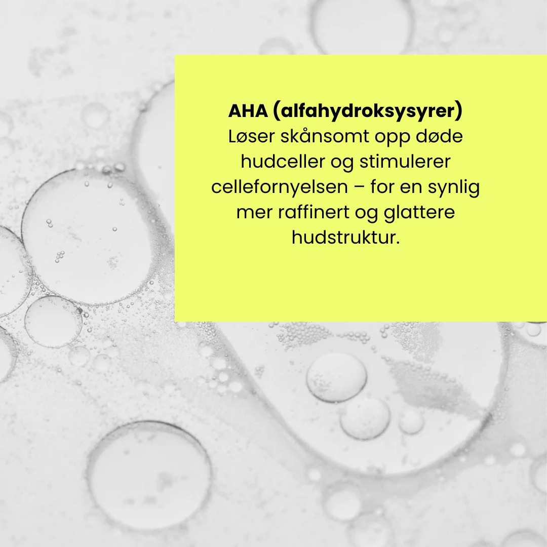 - 1 % AHA (fruktsyre) løser forsiktig opp døde hudceller, stimulerer naturlig cellefornyelse og gir et synlig mer raffinert hudbilde – uten å irritere eller svekke hudbarrieren.