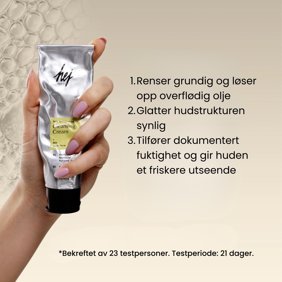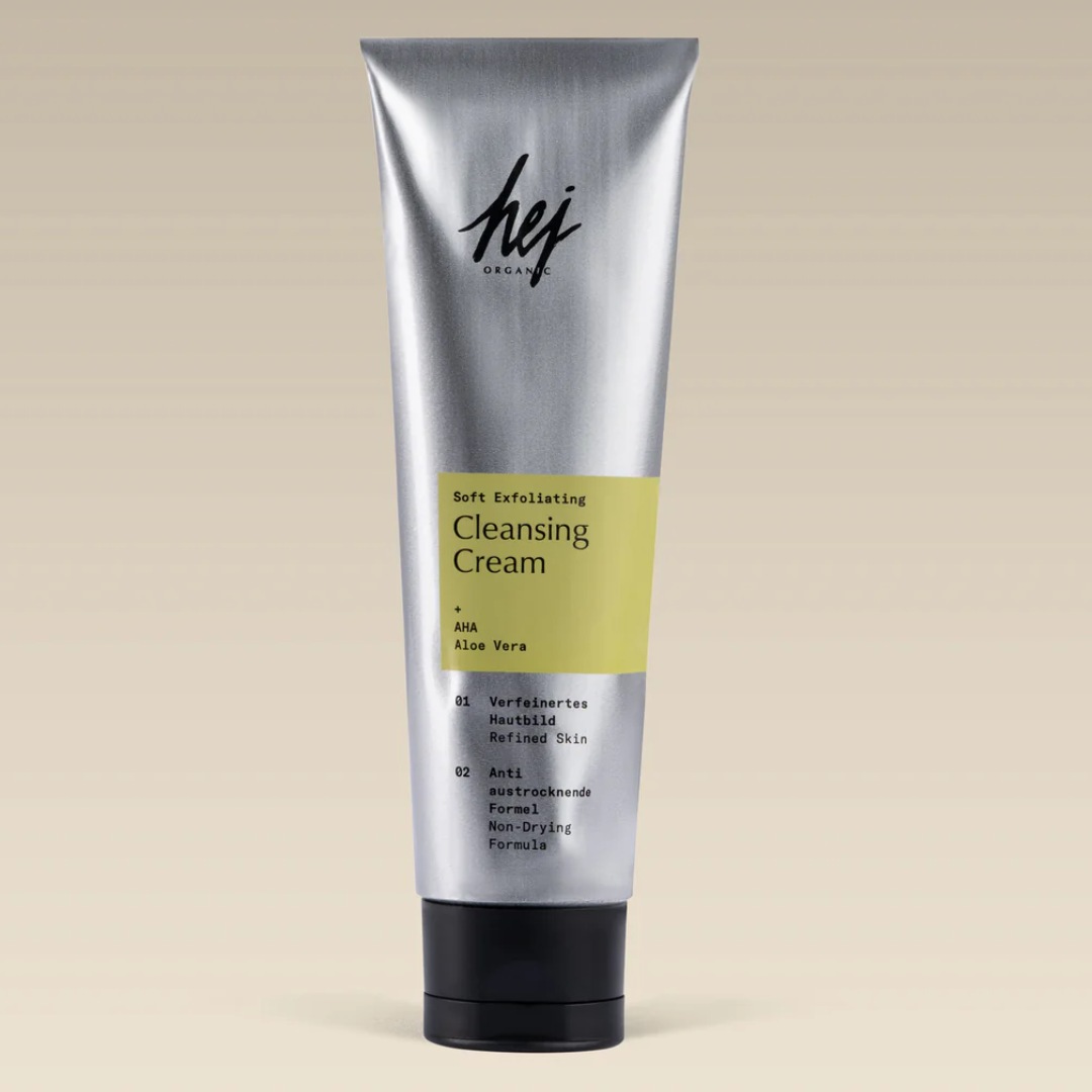 Hej Organic Soft Exfoliating Cleansing Cream with AHA- 100 ml er en mild, eksfolierende rensekrem, som kombinerer daglig rens med skånsom cellefornyelse. Den er utviklet for å støtte hudens naturlige regenerering uten å svekke hudbarrieren – og gir en klarere, glattere og mer balansert hud over tid. Den er kremet og myk, og danner et lett skum i kontakt med vann. Den har en frisk duft av grapefrukt og fersken, med et hint av jasmin og en rolig sedertre i bunnen. Ordet parfum i INCI, betyr bare duft og er allergenfrie eteriske oljer). Den kremete teksturen fjerner smuss, overskuddstalg og miljørester uten å tørke ut huden eller forstyrre dens naturlige balanse.