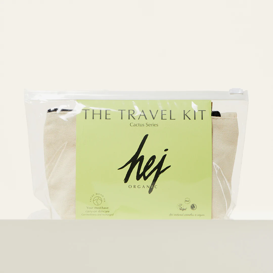 Reisesett med fire populære og praktiske produkter for reisen, levert i en praktisk toalettmappe fra Hej Organic. 100% naturlig og effektiv hudpleie.