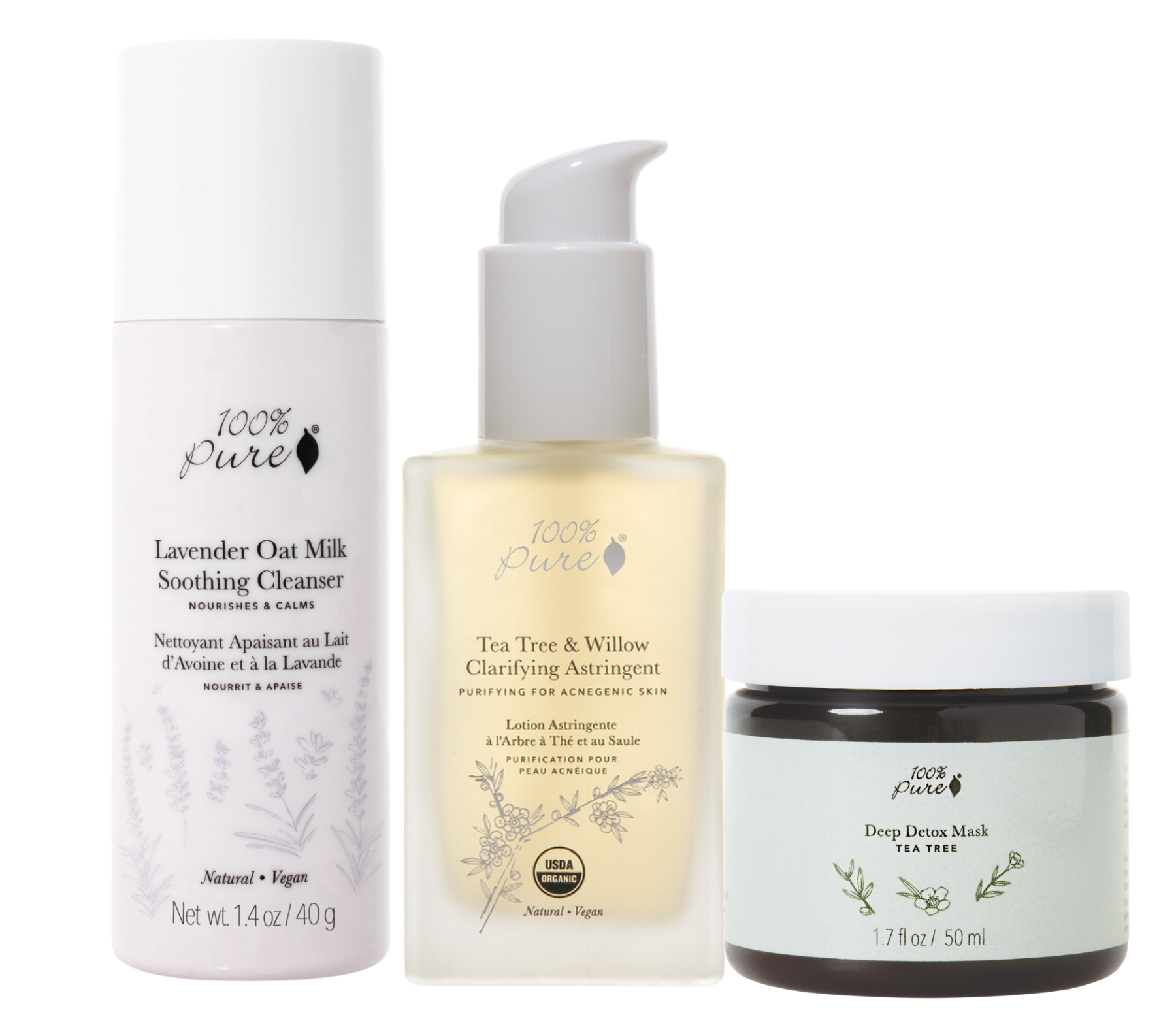 Hudpleiepakke 100% Pure Acne CleansingTrio er en hudpleiepakke med naturlige renseprodukter for en fet hud og en hud med kviser og urenheter. I tillegg til renseproduktene får du en detox maske som renser i dybden og som også roer ned huden. Disse produktene virker på en skånsom måte og passer alle hudtyper, både tørr og fet hud, og sensitiv hud med kviser. Regulerer og balanserer huden, klargjør og reduserer betennelser i kvisene.