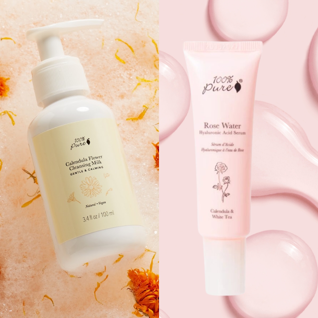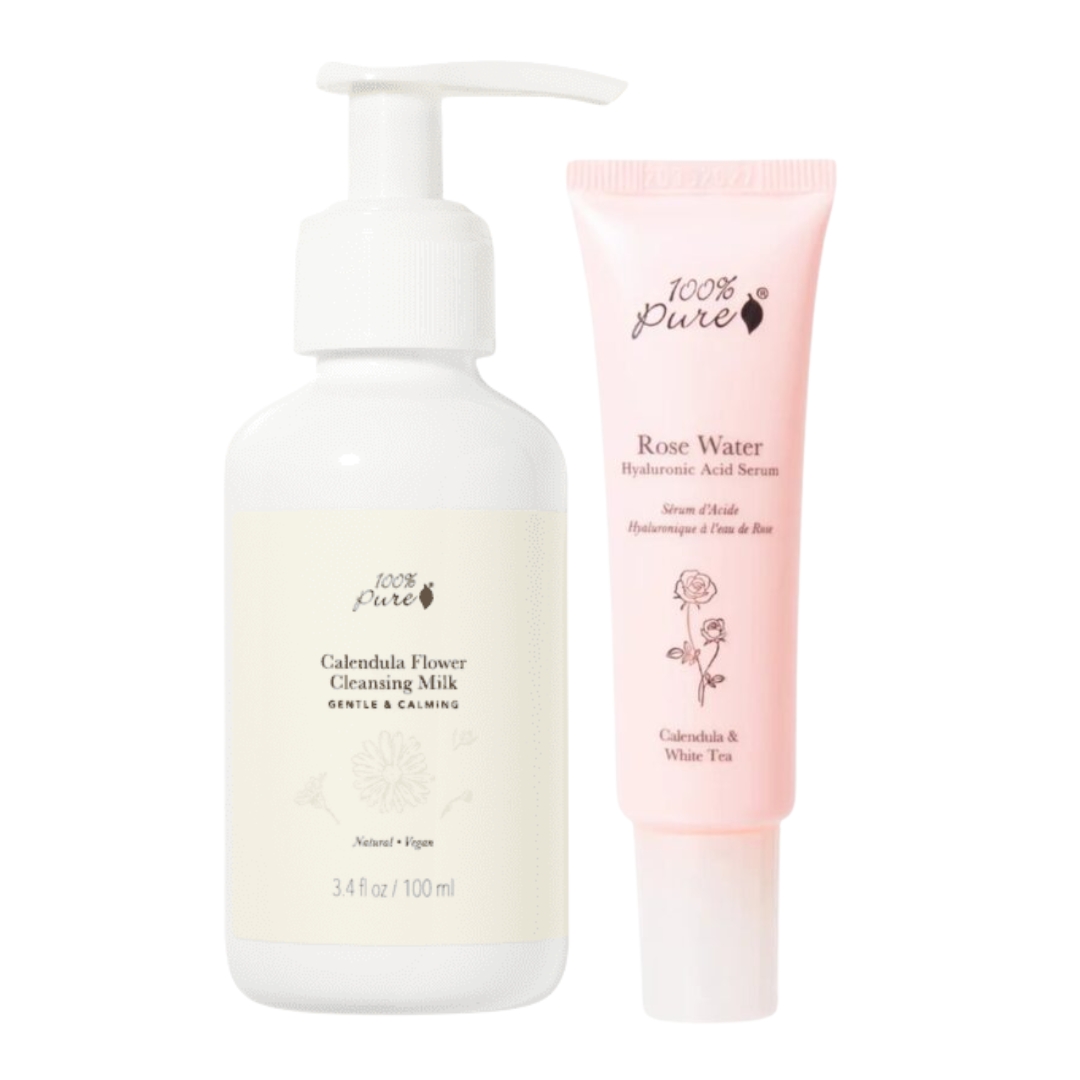 Hudpleiepakke 100% Pure: Calendula Flower Cleansing Milk + Rose Water Hyaluronic Acid Serum Duo