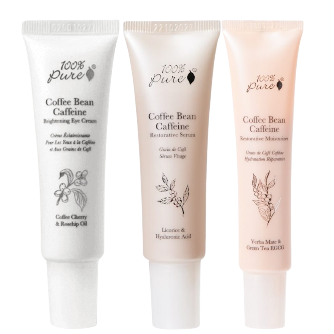 Coffee Bean trio som lysner, strammer opp og reparerer UV-skader. Serum, krem og øyekrem som gir glød, sirkulasjon og en mer våken hud.