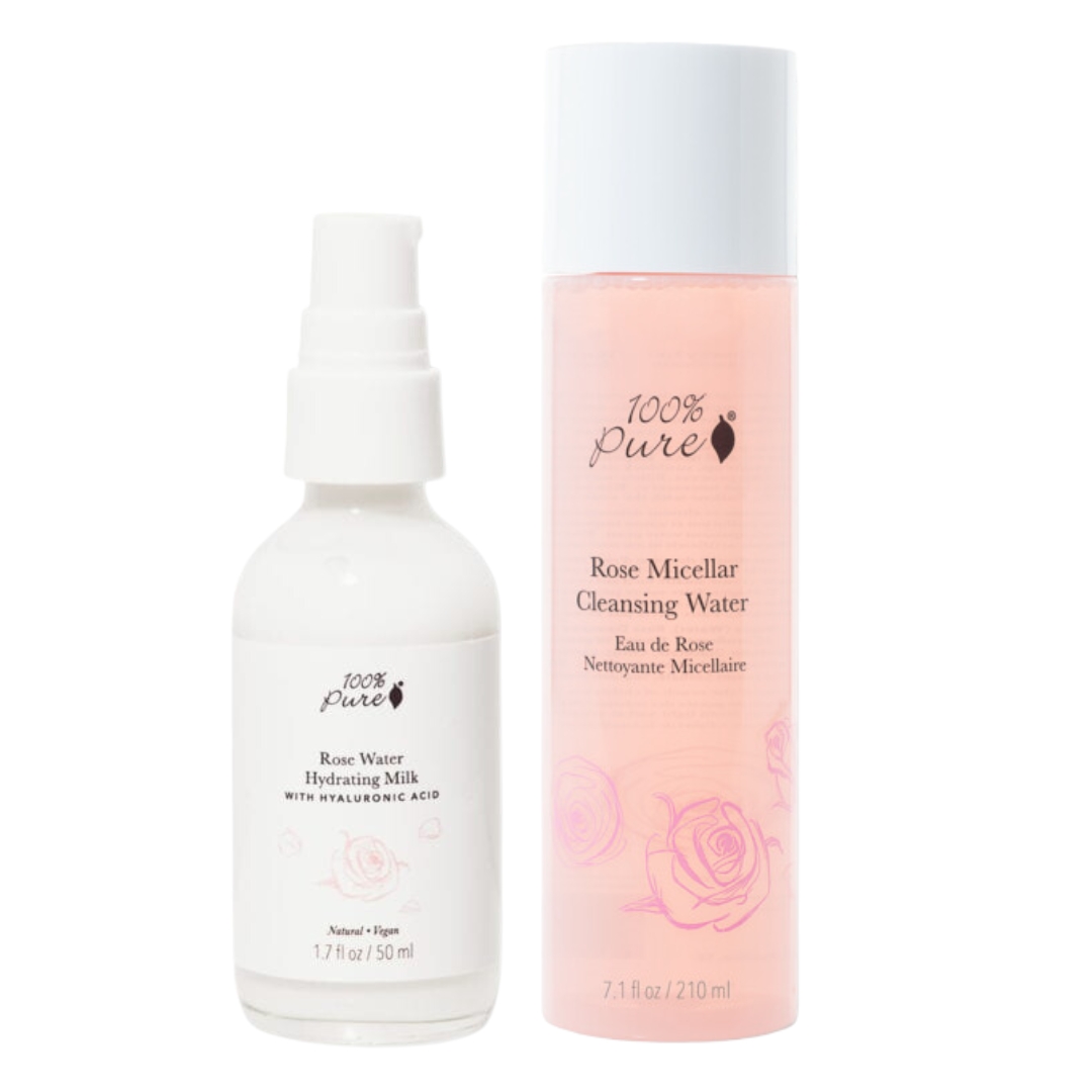 Rose Micellar Water og Rose dagkrem, som skånsomt renser huden og fjerner øyesminke. Rose Water Hydrating Milk er en mild fuktighetskrem. Passer alle hudtyper.