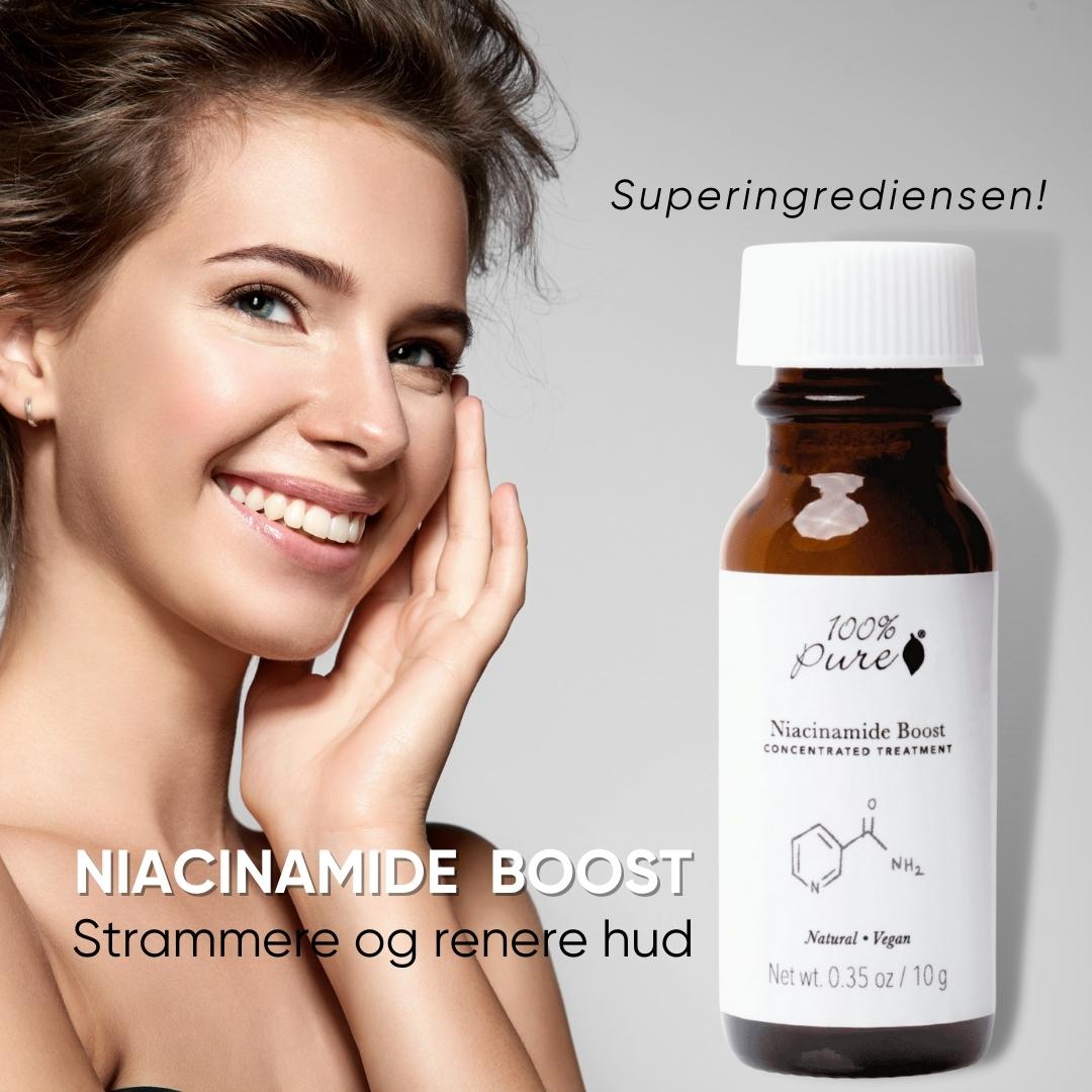 - 100% Pure Niacinamide Boost Niacinamide er en populær ingrediens i hudpleie, fordi det gjenoppretter hudens ungdommelige tekstur, og gir en jevnere hudstruktur. Det inneholder kun to ingredienser Niacinamide (Vitamin B3) og Hyaluron syre.