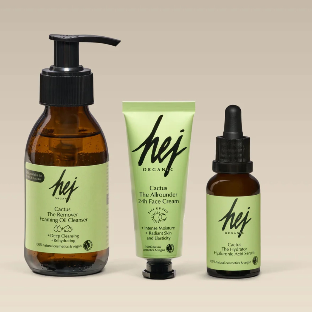 Hudpleiepakke Hej Organic: Cactus Oil Cleanser + Hyaluronic Acid Serum og The Allrounder Cream Trio
