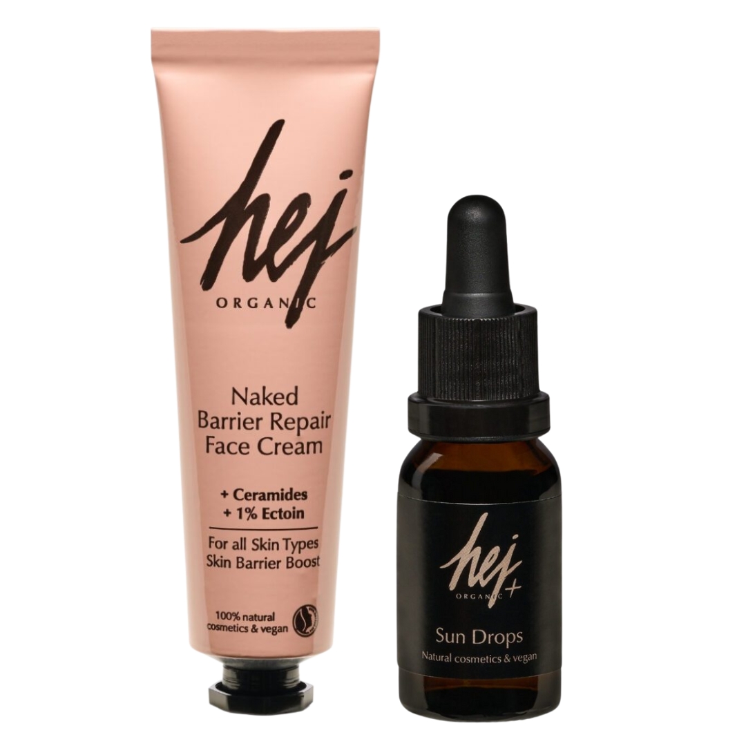 Naturlig selvbruning + barrierepleie. Hej Organic Sun Drops og Barrier Repair Cream gir jevn glød, hydrert hud og sterk hudbarriere – helt uten UV-skader.