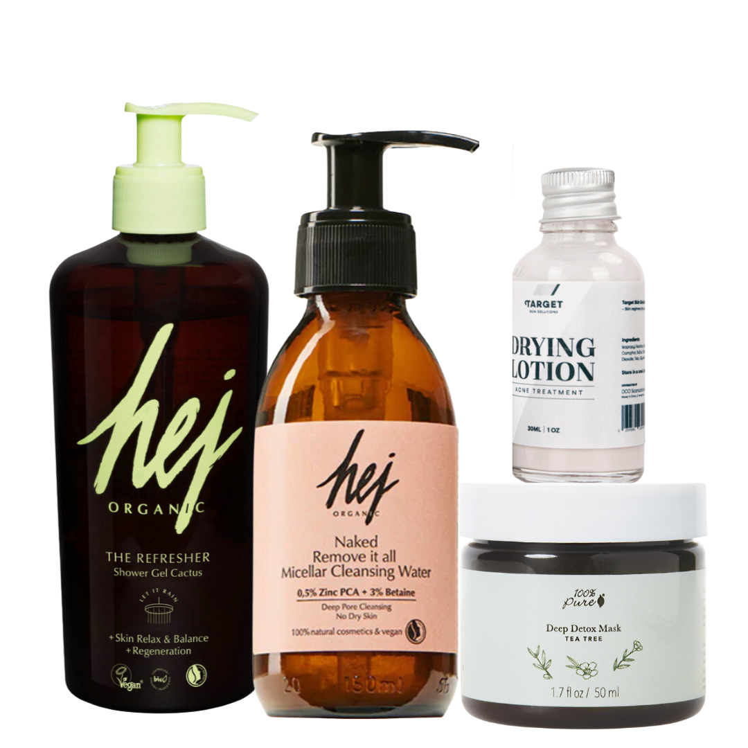 Effektive produkter som er spesielt satt sammen for å behandle kviser på rygg og bryst. Rens, toner, rensemaske og dyptvirkende kvisemiddel.