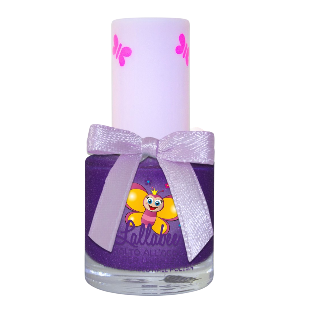 Lallabee trygg vannbasert neglelakk for barn – Morrelina – 9 ml – er en vannbasert, trygg og giftfri neglelakk for barn i en mørk lilla farge med glitter. De er ikke heldekkende, men gir god farge.