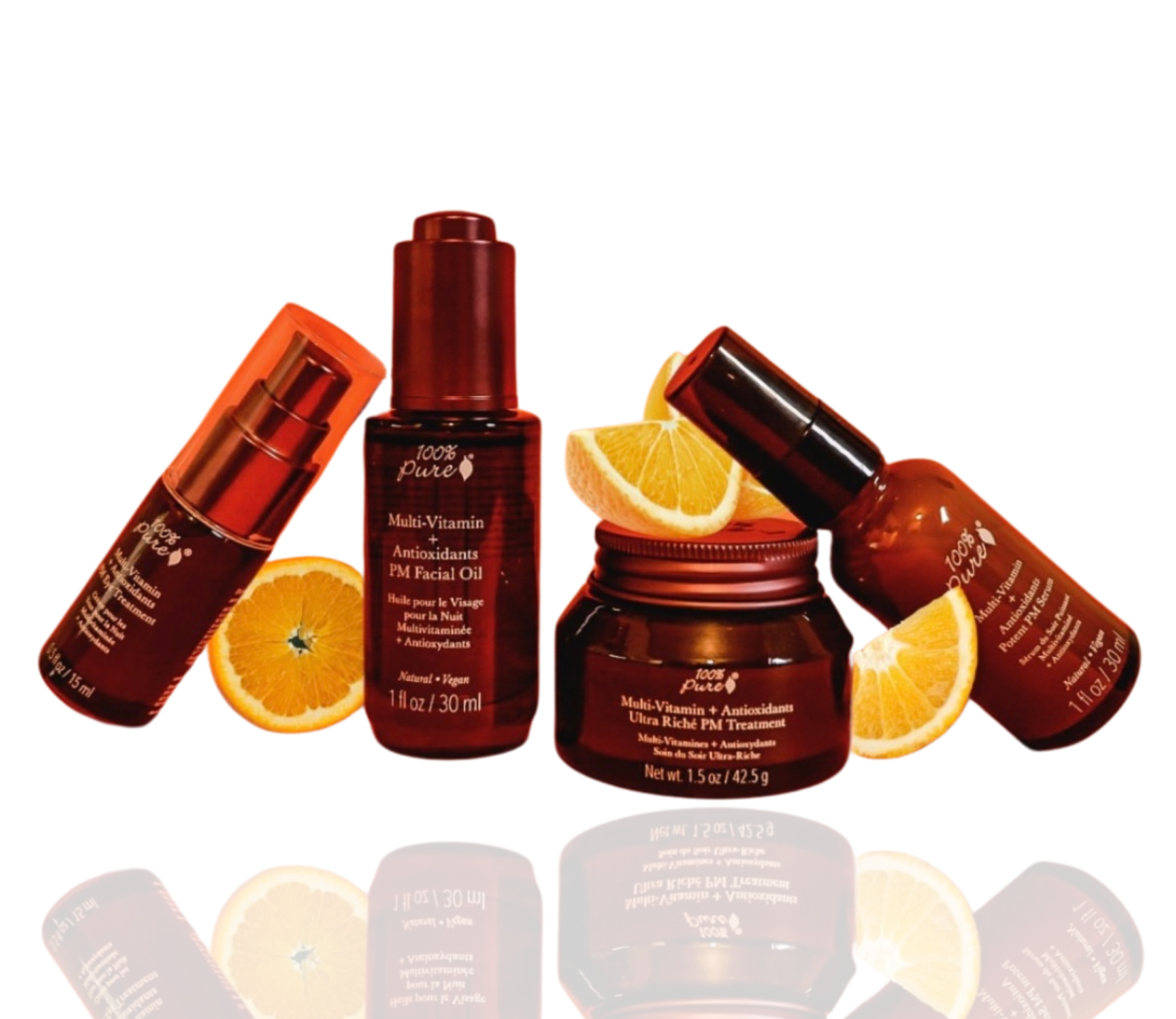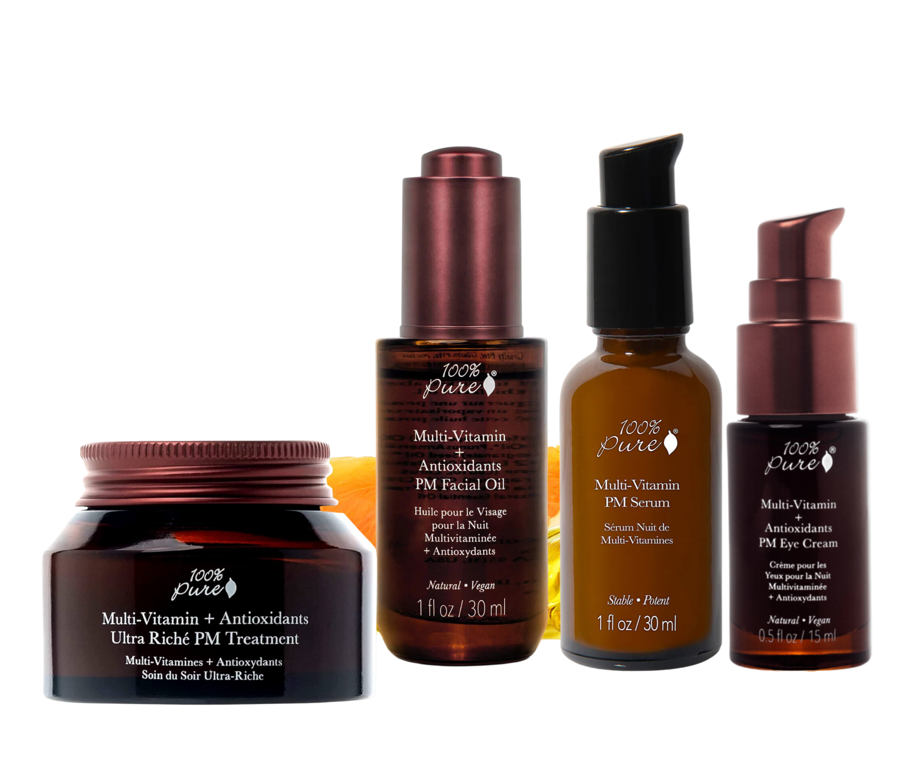 Hudpleiepakke 100% Pure Multi-Vitamin + Antioxidants Nattpleie- 4 stk er alle de fire populære produktene i PM serien til 100% Pure. Dette er en luksuriøs hudpleiepakke proppet fulle av anti aldrende og beskyttende vitaminer og antioksidanter, som i kjente anti aldrende (forebyggende og behandlende) ingredienser som Vitamin A (retinol), Vitamin C, CoQ10 Enzyme og Vitamin E og mange andre velgjørenende og næringsrike ingredienser. De passer perfekt sammen.De gjør jobben mens du sover og du våkner til en “ny hud”. De sterke anti aldrende antioksidantene, nøytraliserer frie radikaler som bryter ned huden, de reparerer huden, styrker cellefornyelsen og gir masse fuktighet og næring, mykere hud og ikke minst, jevnere hud og masse glød.