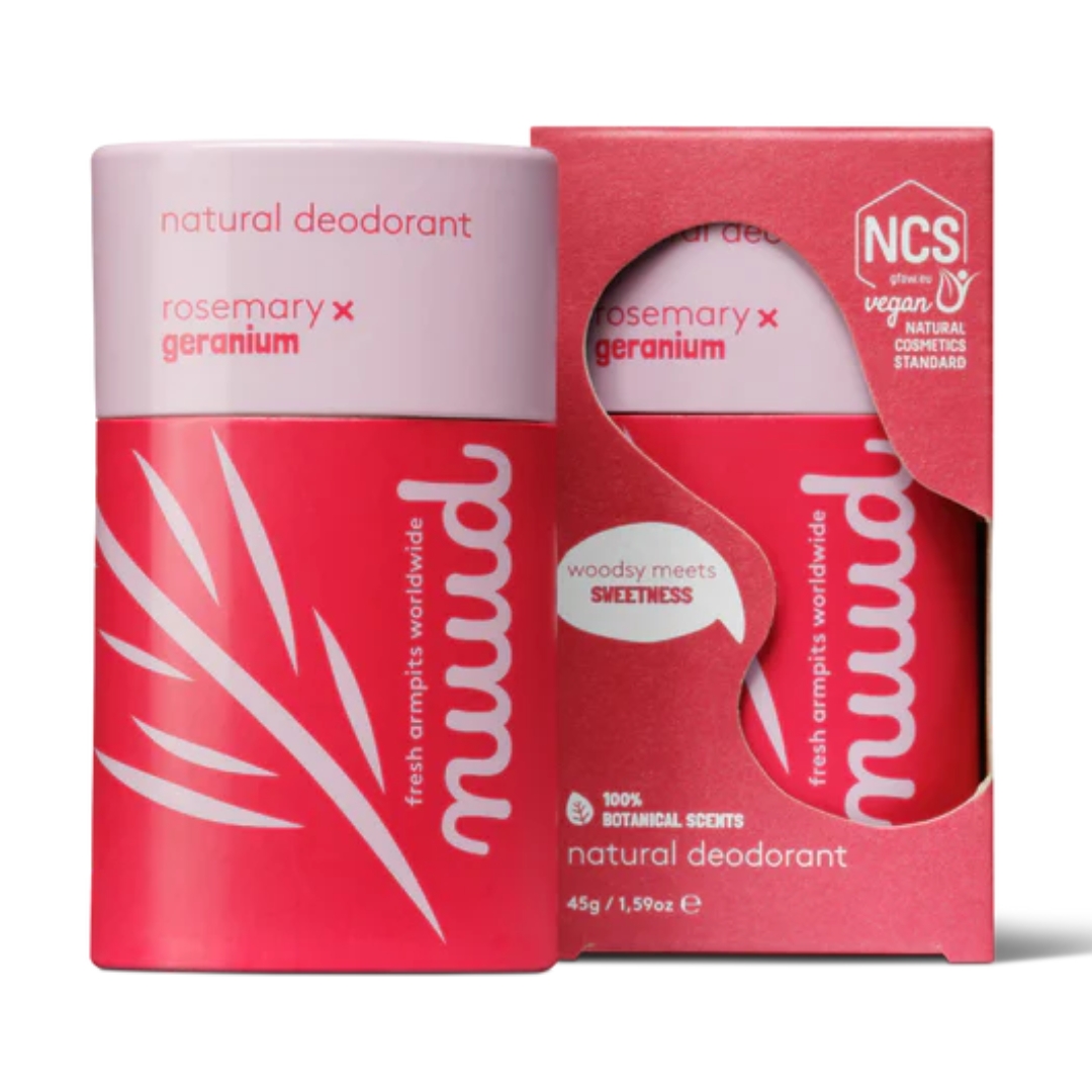 Nuud Naturlig Deodorant Stick Rosemary x Geranium – 45 gr er en naturlig deodorant med en naturlig friskhet. Det er en 100 % naturlig, vegansk deodorant som gir deg opptil 48 timers friskhet. Med en nydelig duft fra eteriske oljer av rosmarin og geranium, er dette et trygt og effektivt alternativ for deg som ønsker å unngå aluminium, parfyme og syntetiske tilsetninger.