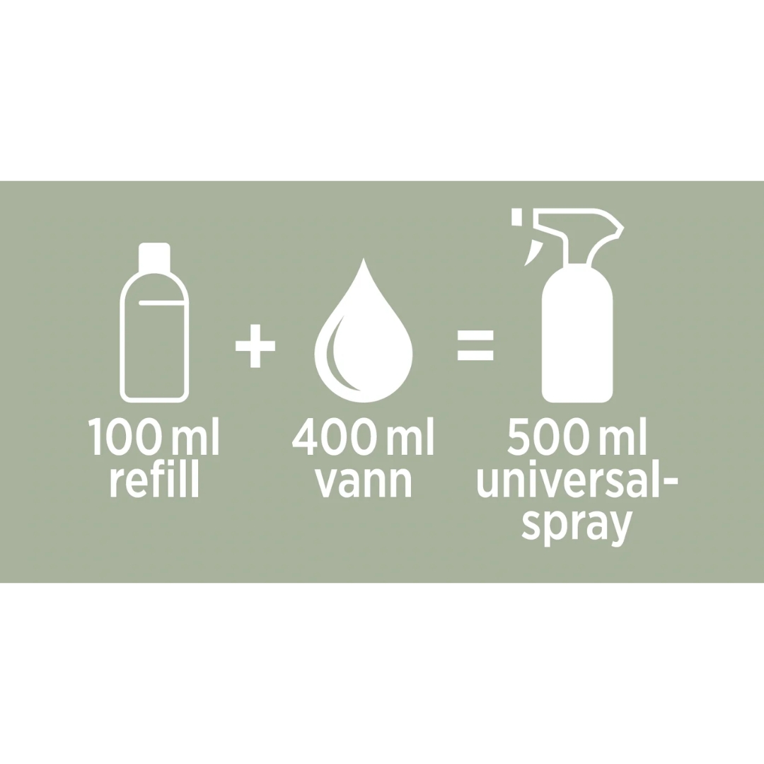 Produktnummer: 1406770000-1Konsentrert refill til universalspray. Rengjør effektivt kjøkken, bad og glass. Med antibakteriell effekt og naturlig sitronduft. Miljøvennlig valg.