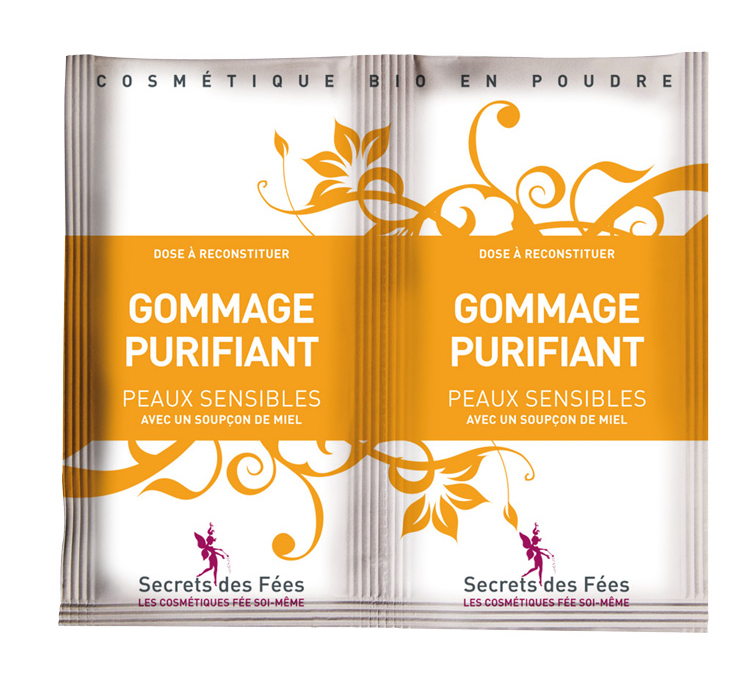 Secrets des Fées Gommage Purifying Sensitive Skin – Ansiktsskrubb – (2 stk x 8 gr) er en rensende skrubb for sensitiv hud. Hemmeligheten er en ultra mild skrubb, som pleier huden skikkelig. Den inneholder honning, banan, kakao, lakris. En genuin pleie som roer ned, beskytter og gir næring til huden, og etterlater den beroliget og skinnende ren. Man kan blande pulveret med springvann, flaskevann, mineralvann eller rosevann. (Gommage betyr skrubb, Purifiant betyr rensende.)