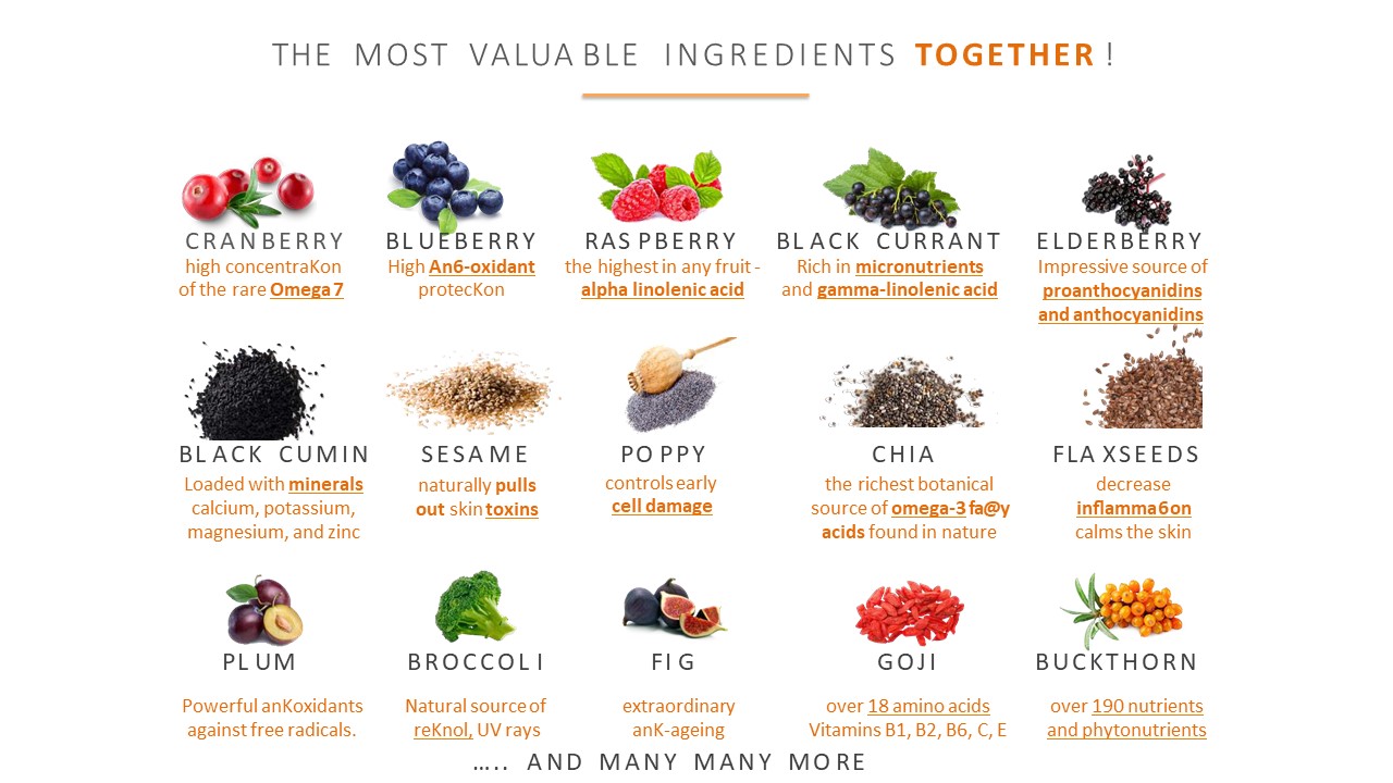 Super Seeds oljene kommer fra blant annet fra Cranberry, Elderberry, Chia Seeds, Black Currant, Black Cumin, Plum, Flaxseeds, Raspberry, Poppy, Sesame, Fig, Goji og flere andre. Disse oljene har mange ulike egenskaper, som gir viktige mineraler, vitaminer, fettsyrer, antioksidanter, virker rensende, detoxifiserende, er anti aldrende,er cellefornyende og reparerende, beskyttende, gir mange næringsstoffer og reduserer inflammasjon. Satt sammen på en unik måte, som gjør dem svært effektive og helt nydelige på huden.