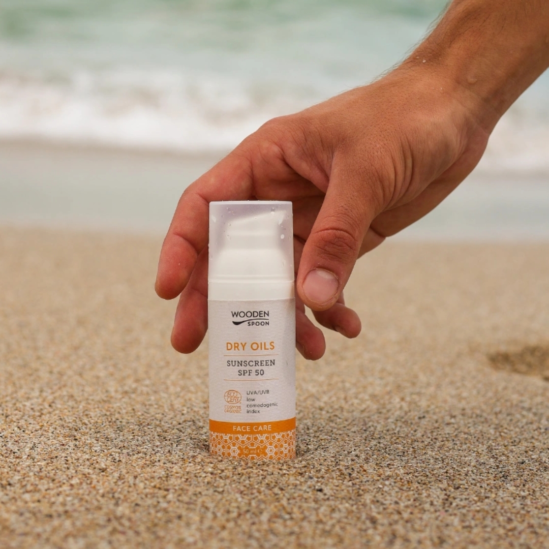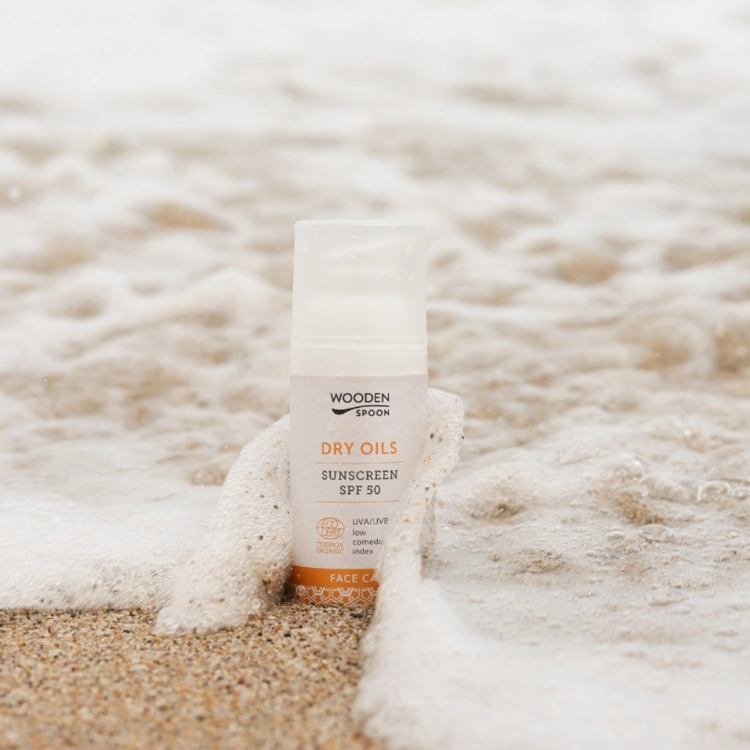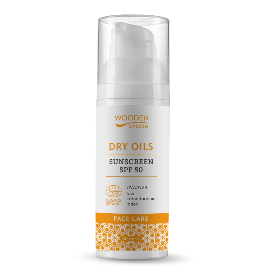 Wooden Spoon Face Sunscreen Lotion “Dry oils” SPF 50 – 50 ml er en 100% naturlig solkrem for ansiktet, med en lav comedogenic index. Denne nye ” dry oil” (tørr olje) serien er spesielt formulert med “dry oils”, som har en lav comedogenisk index, som betyr ta den ikke tetter porene og er litt mattere på huden.