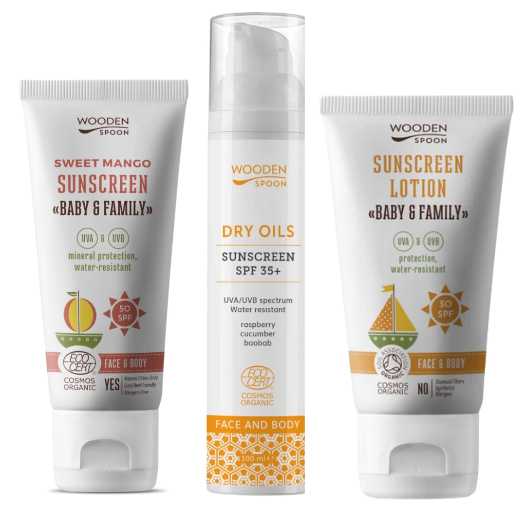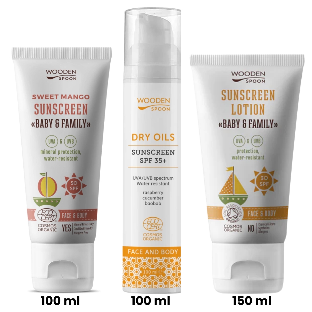 Wooden Spoon Solpleiepakke favoritter – 3 stk er en pakke med 3 populære solkremer, som kan brukes av hele familien. Det er en SPF 50, en SPF 30 og en for ansiktet (men kan også brukes på kroppen) som er SPF 35+.