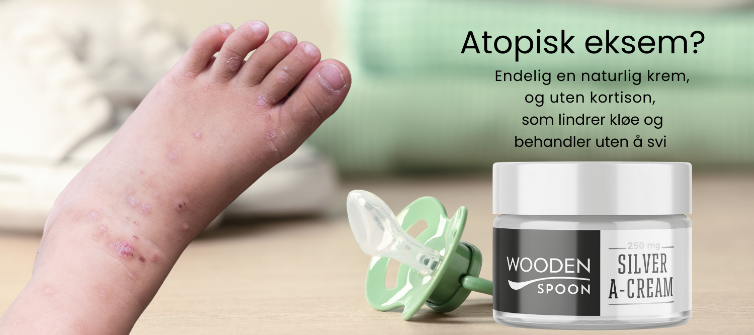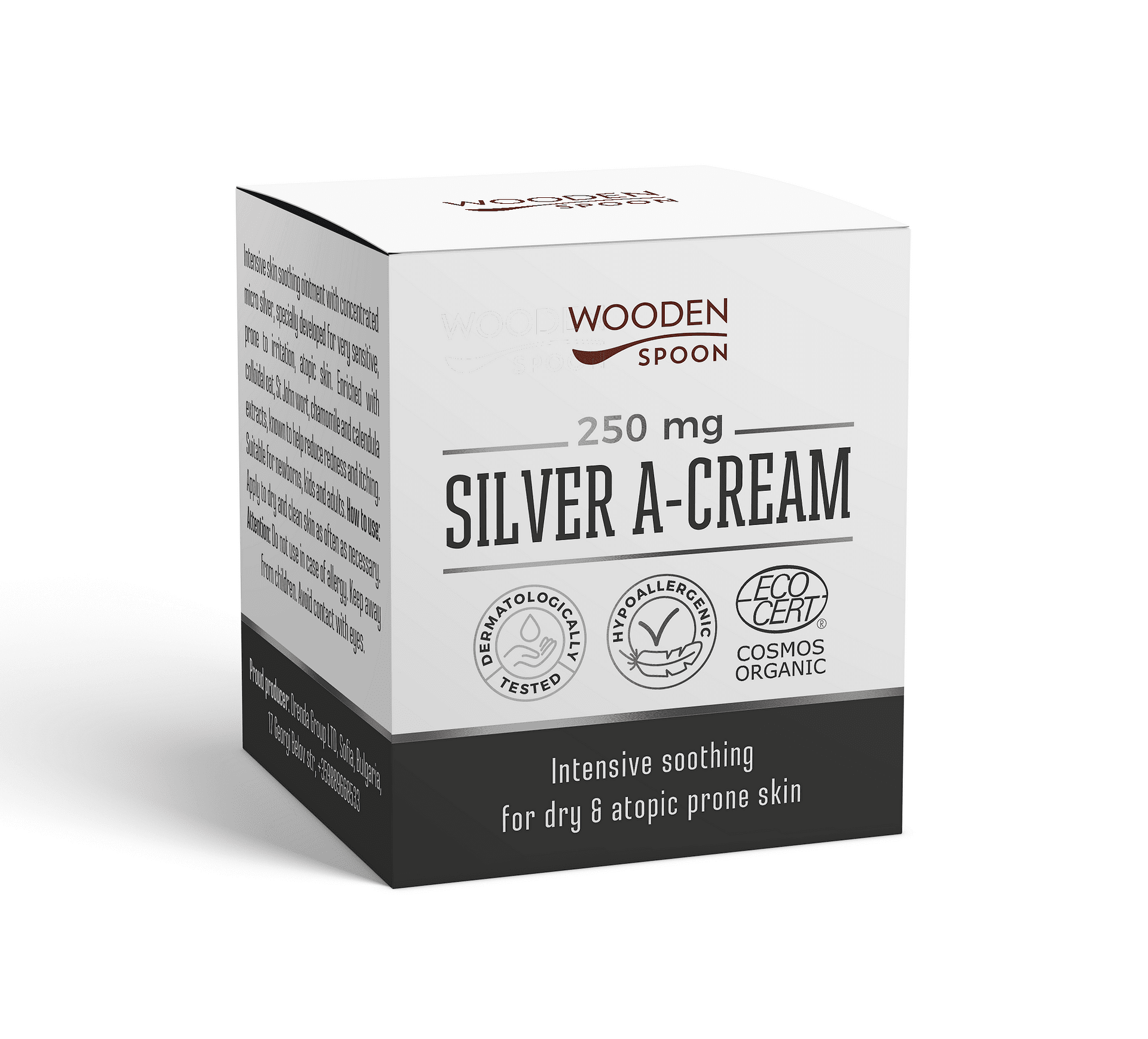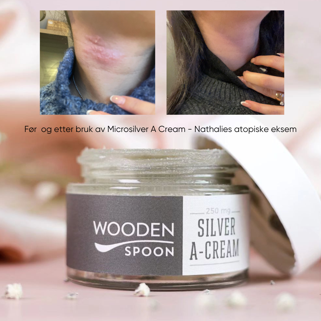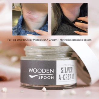 Wooden Spoon Soothing Microsilver A-Cream – 50 ml er en 100% naturlig krem som er spesielt utviklet for å behandle problemhud som atopisk eksem (atopisk dermatitt), svært tørr og irritert hud og rosacea. Kombinasjonen av biosertifiserte oljer. og det høye innholdet av microsølv (250 mg) og aktiv kolloidal havre gir effektiv pleie av huden.